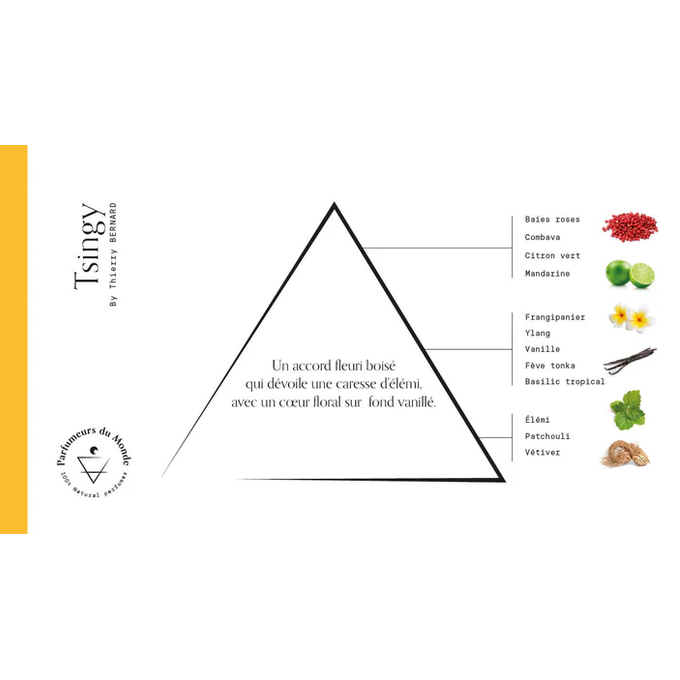 Un parfum delicat ca o atingere de dimineață tropicală, Tsingy dezvăluie o poveste olfactivă născută în inima Madagascarului. Deschiderea este luminoasă și jucăușă, cu accente de combava, lime, mandarină și baies roses – o prospețime efervescentă, asemenea primelor raze de soare ce pătrund prin ceața ușoară. Inima florală, compusă din ylang-ylang și frangipanier, este mângâiată de o vanilie catifelată și tonka gurmandă, înviorate subtil de un strop de busuioc tropical. Baza lemnoasă, cu vetiver, patchouli și un voal fin de élémi, conferă profunzime și eleganță compoziției.