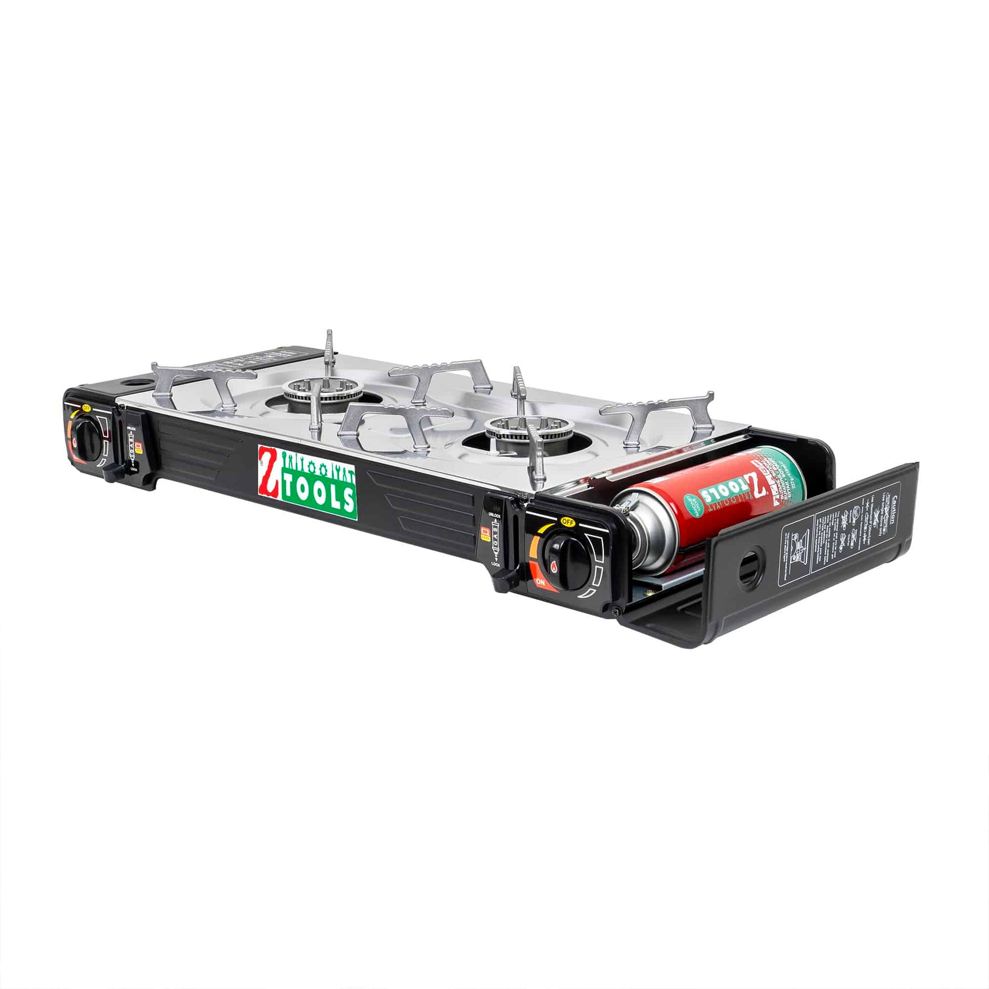 Aragaz camping cu 2 ochiuri, aprindere electrica, putere 2x2.5kw, din inox cu tava gril si cutie de transportat / ZTS 5619