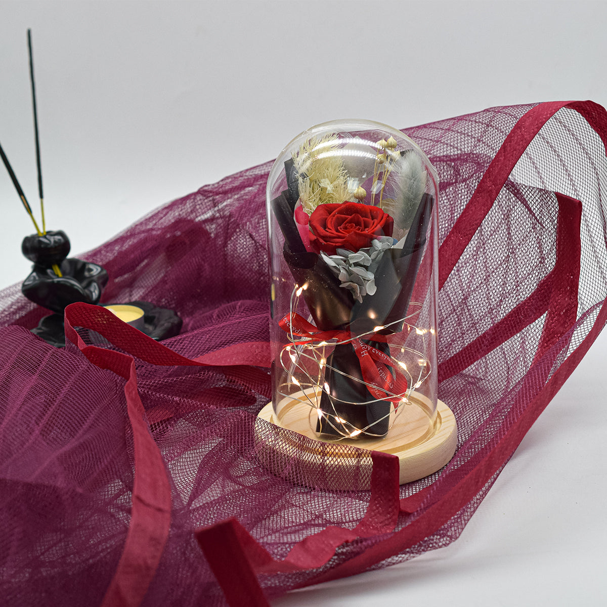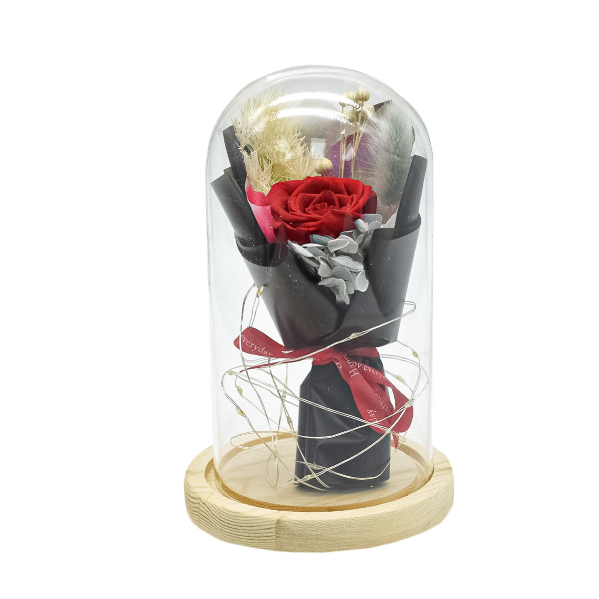 Aranjament floral in cupola de sticla, lumina Led, D4003, Rosu