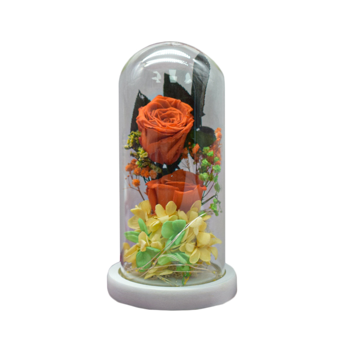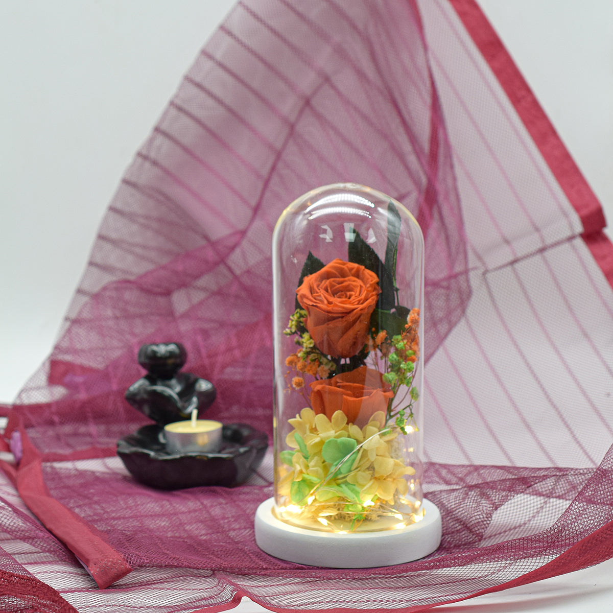 Aranjament floral in cupola de sticla, lumina Led, D4008, Portocaliu