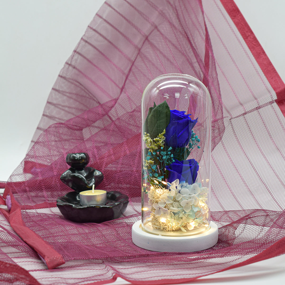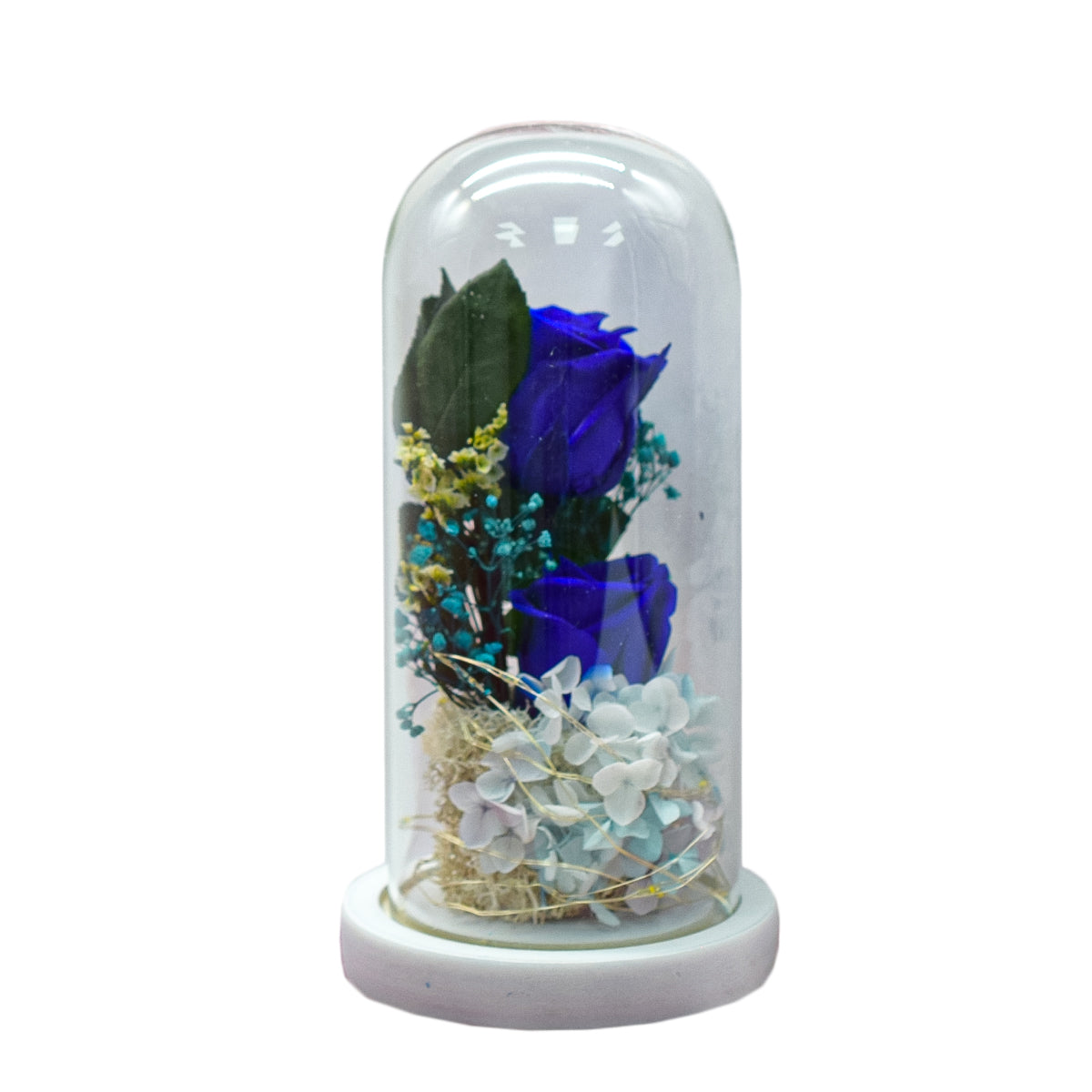 Aranjament floral in cupola de sticla, lumina Led, D4014, Albastru