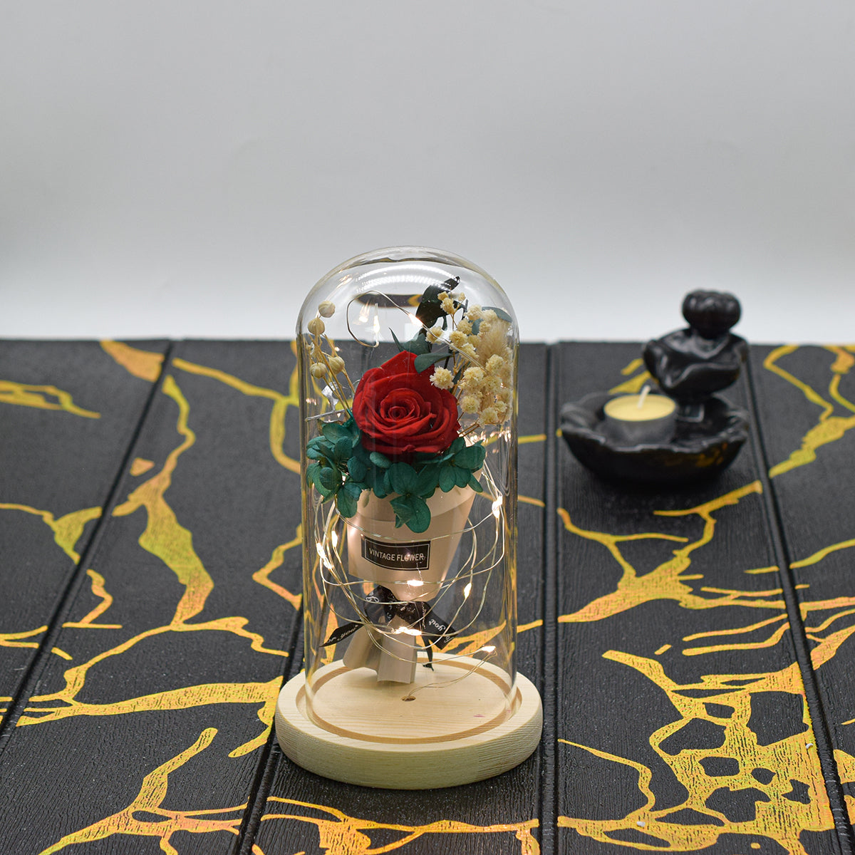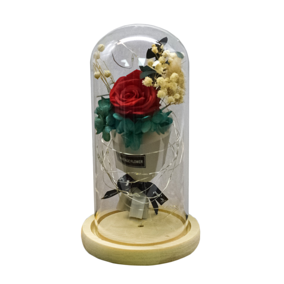 Aranjament floral in cupola de sticla, lumina Led, D4015, Rosu