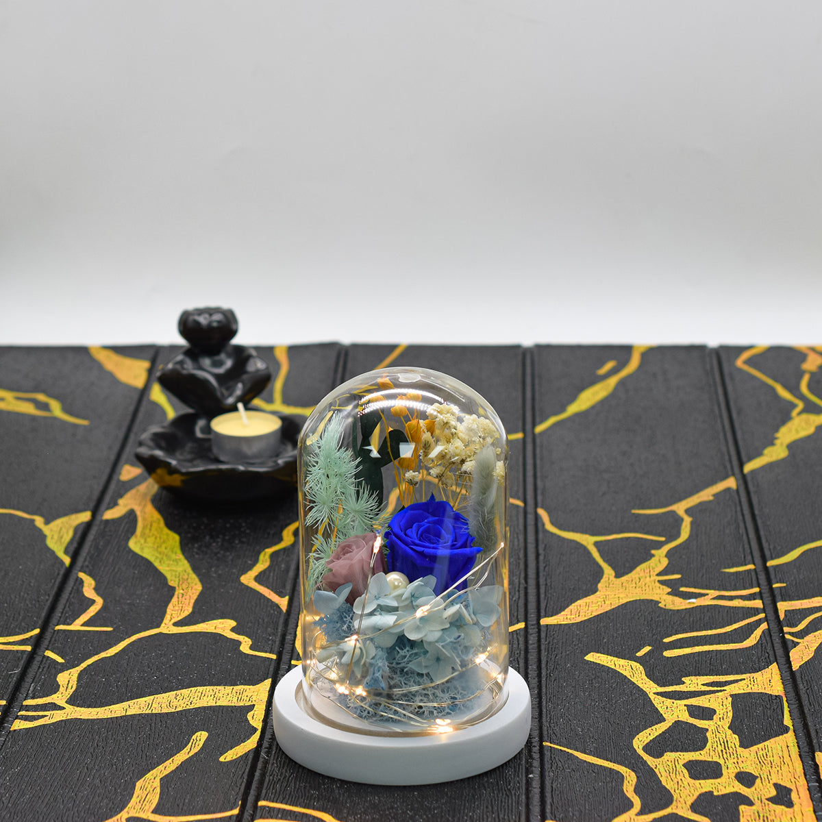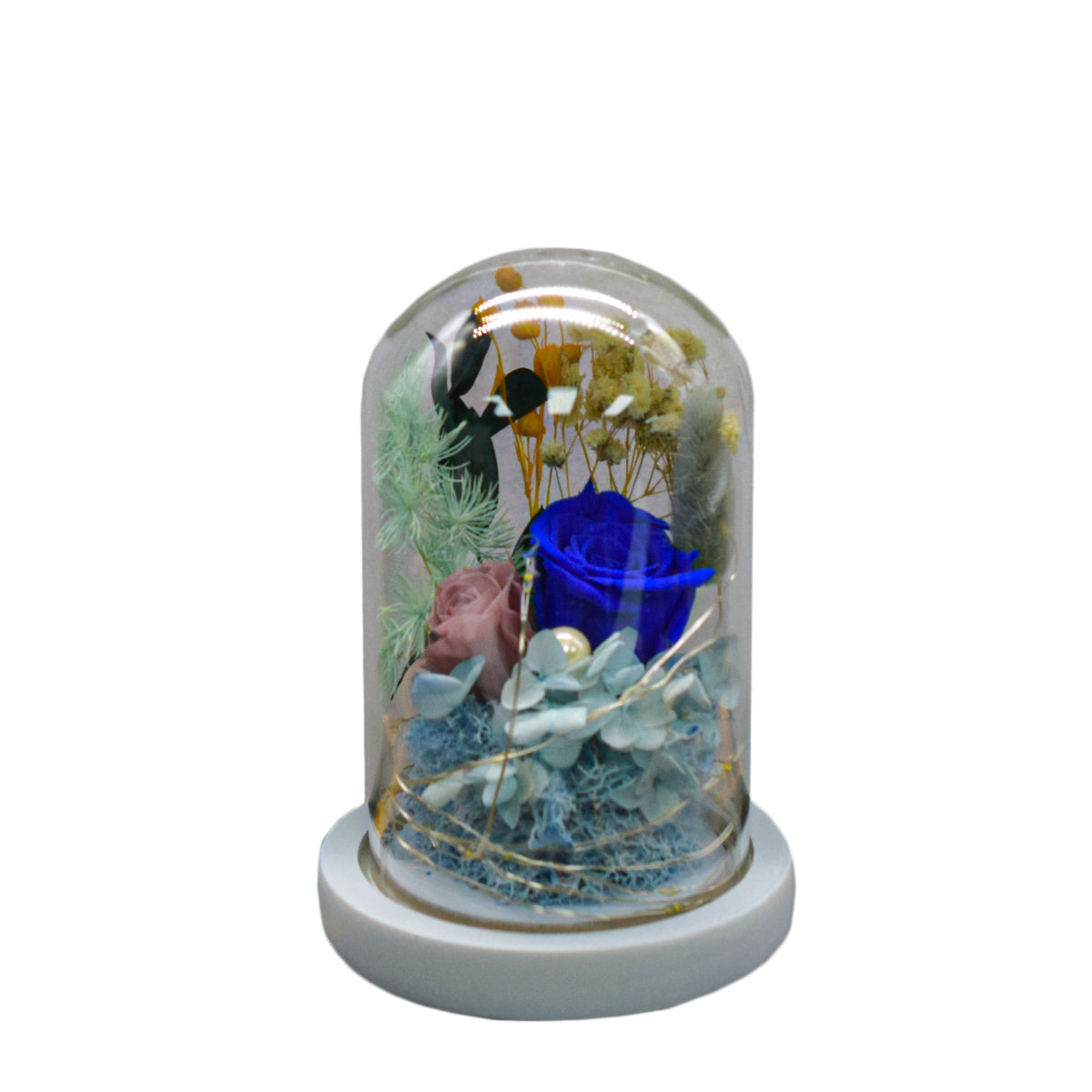 Aranjament floral in cupola de sticla, lumina Led, D4035, Albastru