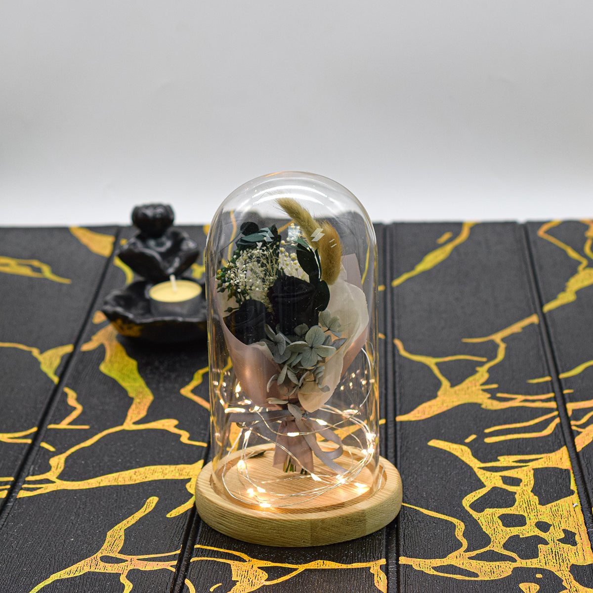 Aranjament floral in cupola de sticla, lumina Led, D4040, Negru