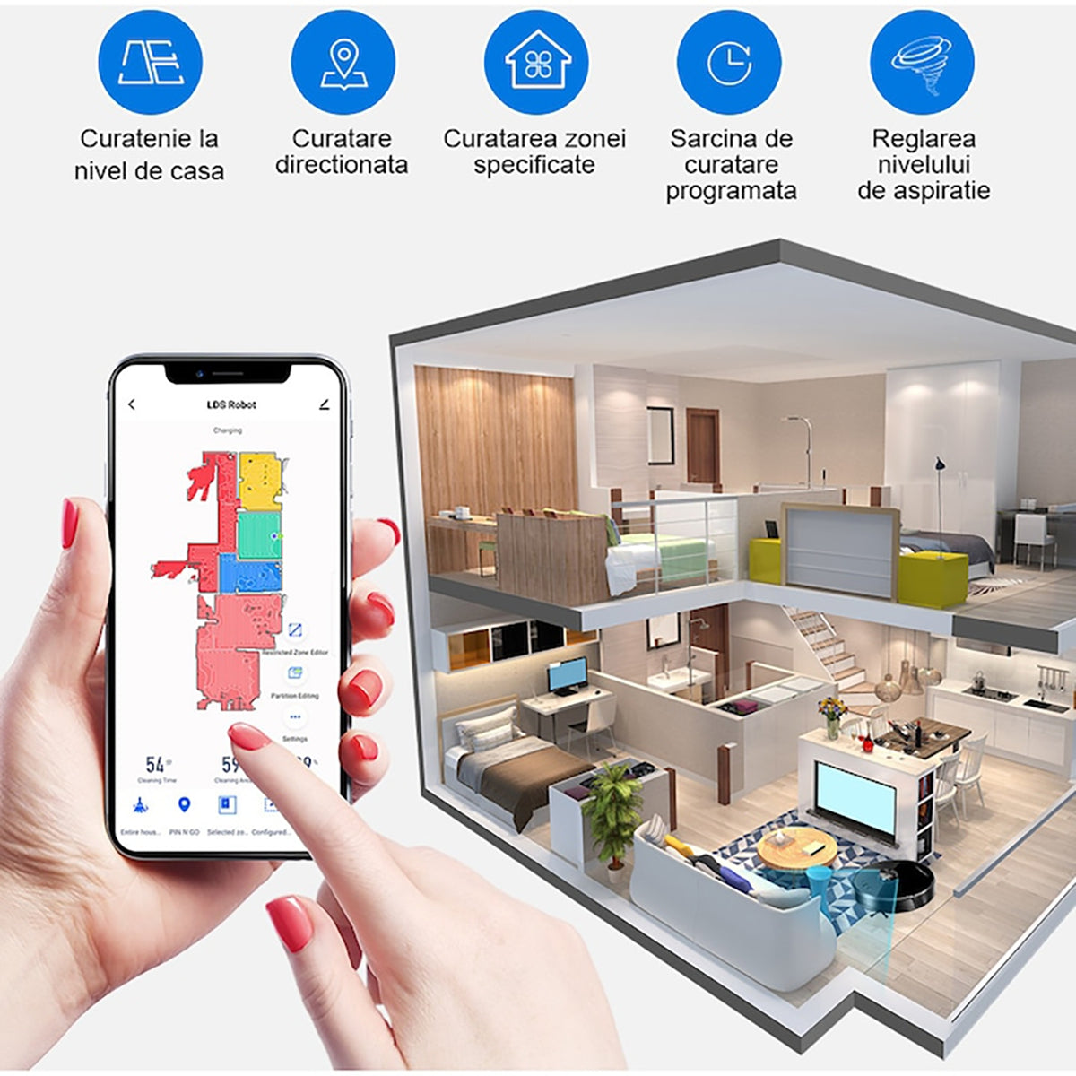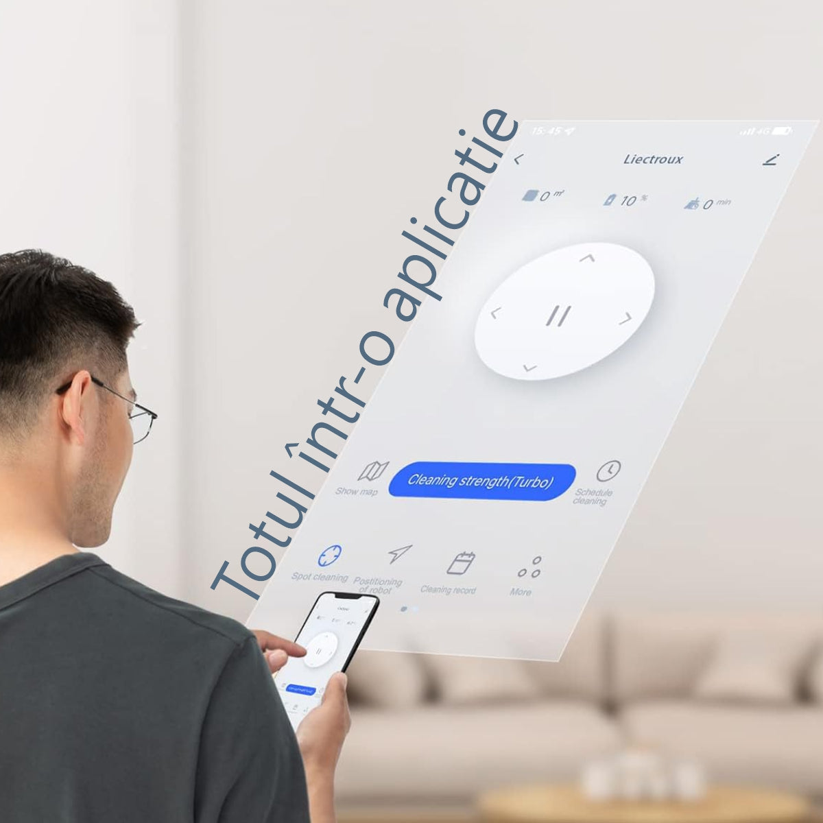 Control inteligent: prin intermediul aplicatiei mobile, poti programa curatarea, seta zone restrictionate si monitoriza progresul