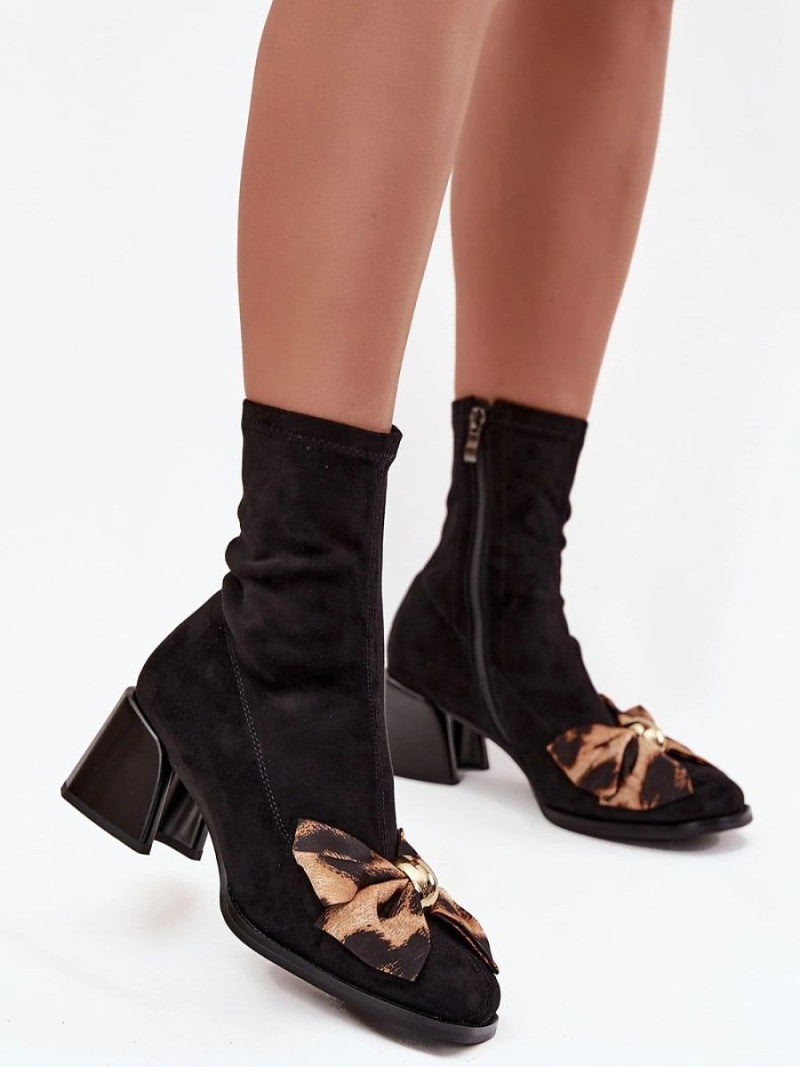 Botinele pentru femei din piele ecologică moale sunt o combinație de eleganță și stil feminin. Modelul plasat pe un toc stabil de tip bloc asigură confortul în timpul purtării zilnice. Atrage atenția fundița decorativă cu un element aurit în față, care adaugă un farmec aparte. Fermoarul de pe lateral facilitează încălțarea și dezbrăcarea, iar vârfurile rotunjite conferă întregii perechi un aspect subtil și clasic. Aceste botine stilate vor completa perfect atât ținutele elegante, cât și cele de zi cu zi.