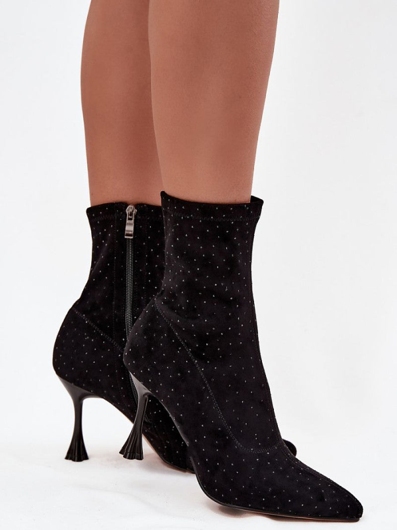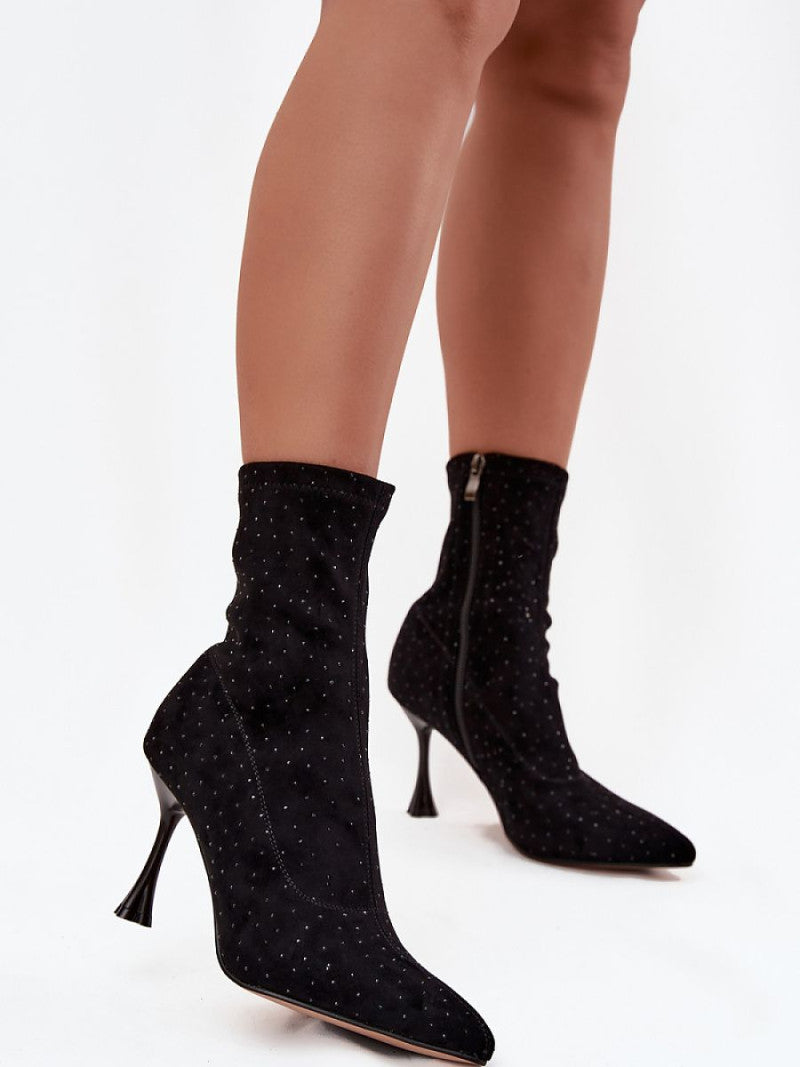 Botinele de damă realizate din catifea ecologică moale sunt alegerea perfectă pentru ieșirile de seară și ocaziile speciale. Modelul impresionează cu cusături decorative și ornamente elegante, care îi adaugă strălucire și caracter feminin. Plasat pe un toc ornamentat de tip ac, accentuează frumos silueta și subțiază picioarele. Vârful ascuțit. Fermoarul de pe lateral facilitează încălțarea. Aceste botine sunt ideale pentru femeile care își doresc să iasă în evidență cu stil, perfecte pentru rochii, fuste și ținute elegante la petreceri sau întâlniri de seară.