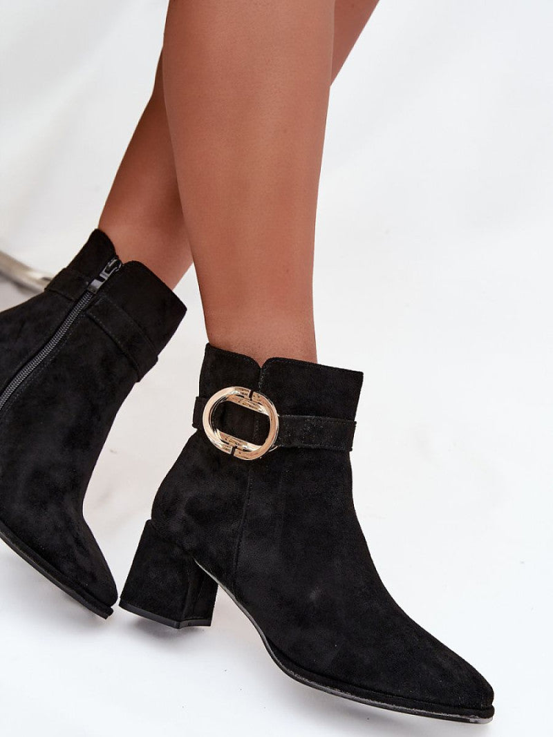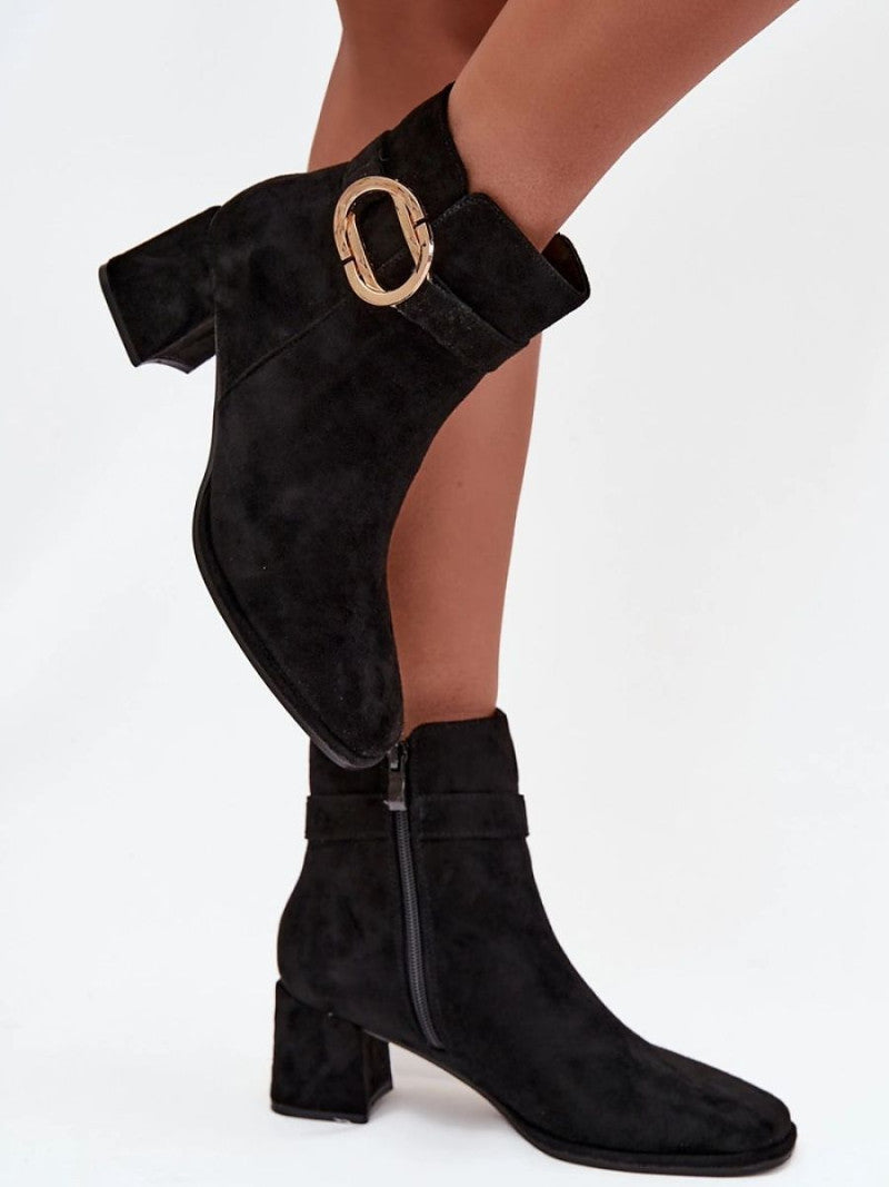 Botinele de damă din piele ecologică sunt o alegere elegantă pentru zilele mai reci. Plasate pe un toc stabil, de tip coloană, acestea oferă confort și subliniază delicat silueta. Fermoarul lateral facilitează îmbrăcarea și dezbrăcarea, iar curea cu cataramă aurie le conferă un caracter elegant. Vârfurile ușor rotunjite. Acest model se potrivește în multe stilizări, atât de zi cu zi, cât și mai elegante.