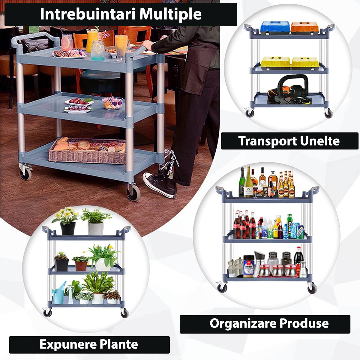 Cărucior Servire cu 3 Blaturi din PP și Cadru Metalic - Funcționalitate și Mobilitate în Servirea Eficientă, 75kg