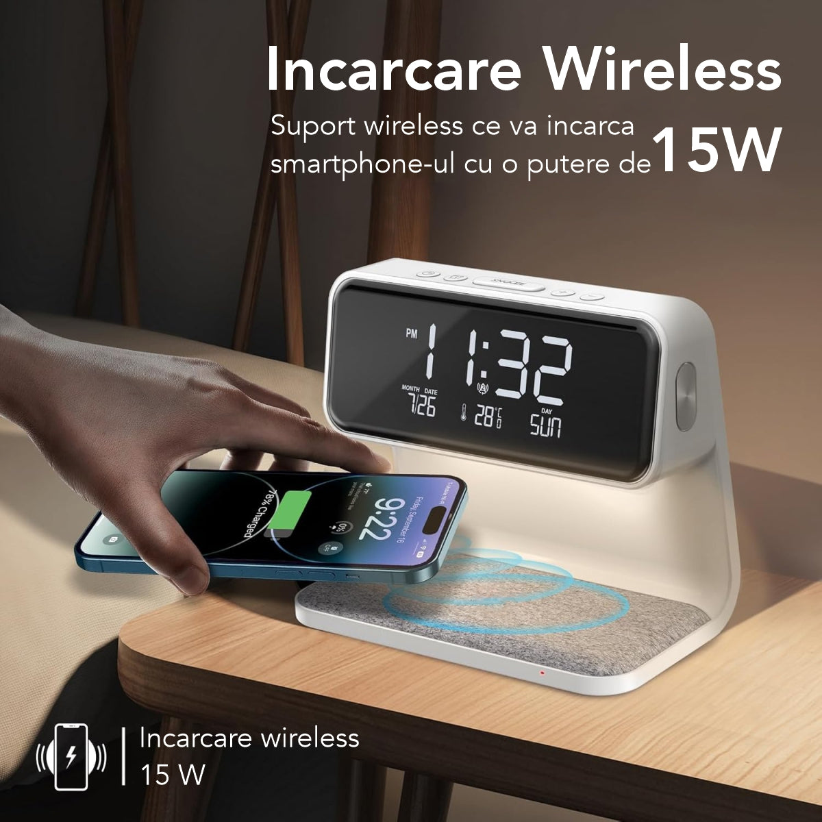 Cu un design modern, acest ceas nu doar afiseaza timpul cu precizie, dar iti si incarca dispozitivele wireless,