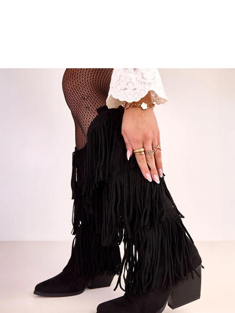 Cizme elegante și pline de caracter cu franjuri decorative, care vor aduce o notă de eleganță boho garderobei tale. Realizate din piele ecologică de înaltă calitate, încântă cu structura lor moale și aspectul spectaculos. Modelul are vârful ascuțit, care subțiază discret piciorul, și toc stabil de tip coloană înalt de 7 cm, asigurând confort și un aspect feminin. Franjurile adaugă ușurință și un stil unic pantofilor, perfect pentru ținutele de toamnă și primăvară. Cizmele se închid cu fermoar, fiind ușor de încălțat. Tija cu înălțimea de 33 cm se așează frumos pe picior, iar tălpicul textil asigură confortul purtării pe tot parcursul zilei. Modelul este neînălțat, perfect pentru zilele mai calde ale sezonului de tranziție.