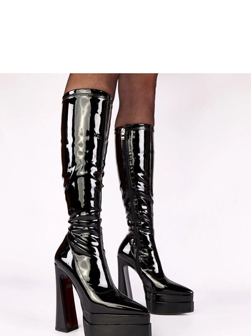 Cizmele lacuite, elegante, fabricate din piele ecologica de inalta calitate, care impresioneaza prin eleganta si stilul modern si expresiv. Shaftul lor inalt de 37 cm pune frumos in evidenta piciorul, creand un look extrem de feminin si curajos. Modelul are varful ascutit, care adauga pantofilor o nota de subtilitate si eleganta. Cizmele sunt asezate pe un toc stabil de 15 cm, iar o platforma suplimentara de 5 cm asigura confortul, usurand presiunea asupra piciorului si facand mersul mai usor, in ciuda inaltimii impresionante a tocului. Interiorul este finisat cu o insertie textila, iar lipsa captuselii face ca modelul sa fie ideal pentru sezoanele de tranzitie sau pentru iesirile elegante. Inchiderea practica cu fermoar faciliteaza incaltarea si descaltarea, avand grija totodata de o potrivire perfecta la picior. Este o propunere pentru femeile care adora stilul luxos si expresiv si doresc sa adauge putin caracter puternic si la moda stilizarilor lor.