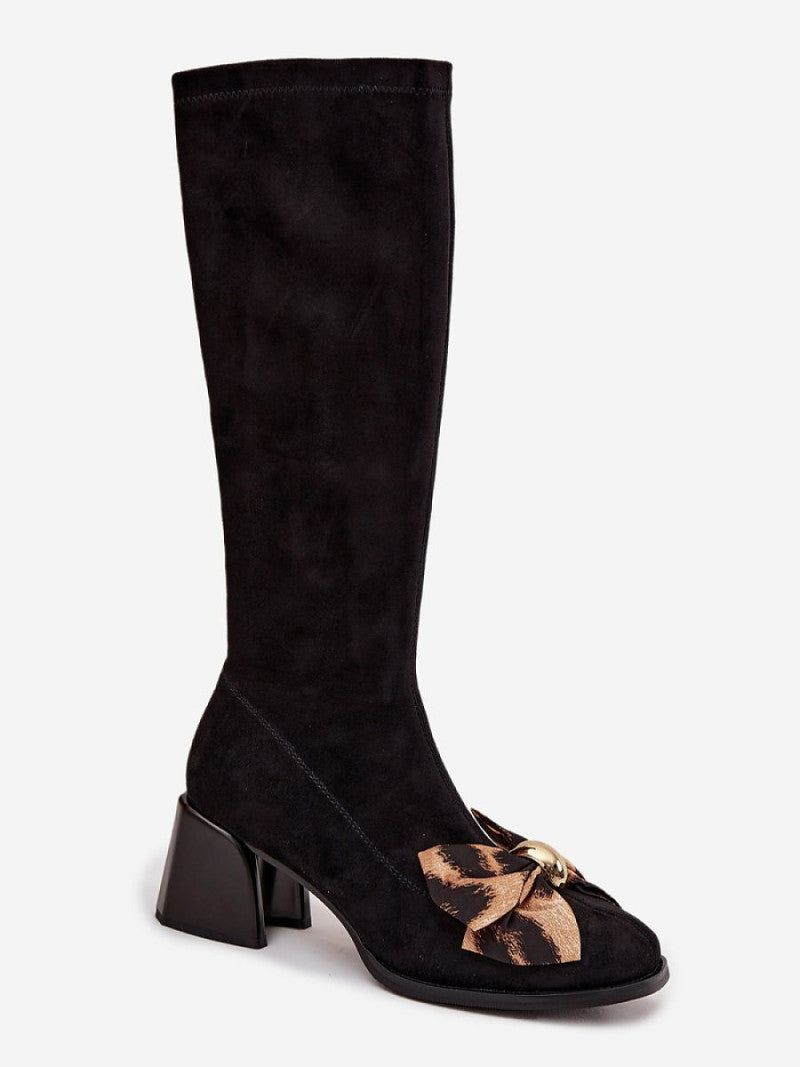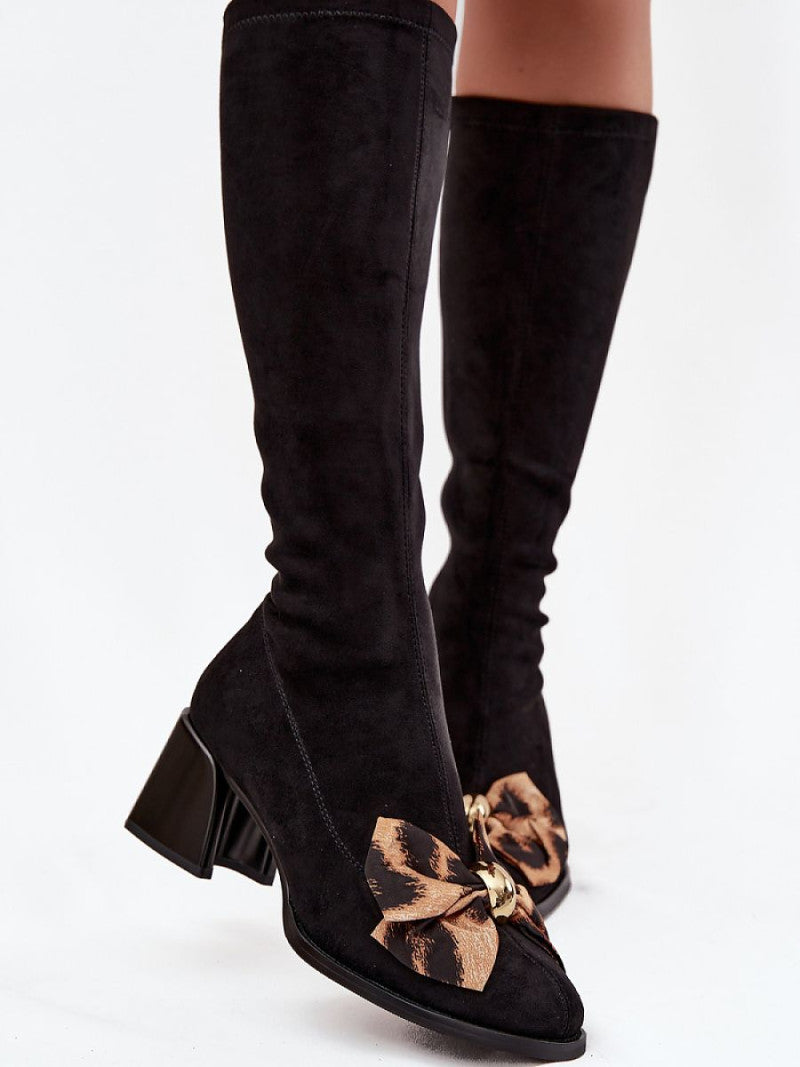 Cizme de damă realizate din piele ecologică moale. Modelul cu fermoar asigură confortul utilizării, iar tocul stabil de tip bloc garantează confortul în timpul purtării. Pantofii se disting prin fundița decorativă cu un element aurit în față, care le conferă un caracter feminin și deosebit. Este o alegere excelentă pentru femeile care apreciază detaliile subtile și aspectul elegant, perfecte atât pentru fuste, cât și pentru pantaloni sau rochii potrivite.