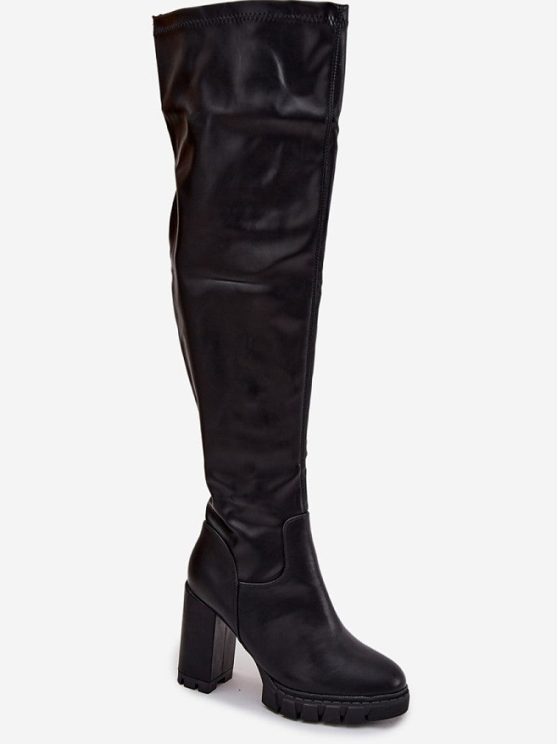 Cizmele de damă peste genunchi cu tălpic înalt sunt o propunere feminină care pune în valoare frumusețea picioarelor. Modelul cu toc înalt subțire subțiază optic silueta și în același timp asigură stabilitate și confort în timpul purtării. Vârfurile rotunjite conferă întregii încălțăminte un caracter delicat și clasic. Cizmele sunt de înfășurat, iar fermoarul lateral facilitează încălțarea lor. Este alegerea ideală pentru femeile care apreciază un aspect modern, se potrivesc perfect atât cu rochii și fuste, cât și cu pantaloni scurți, creând ținute spectaculoase.