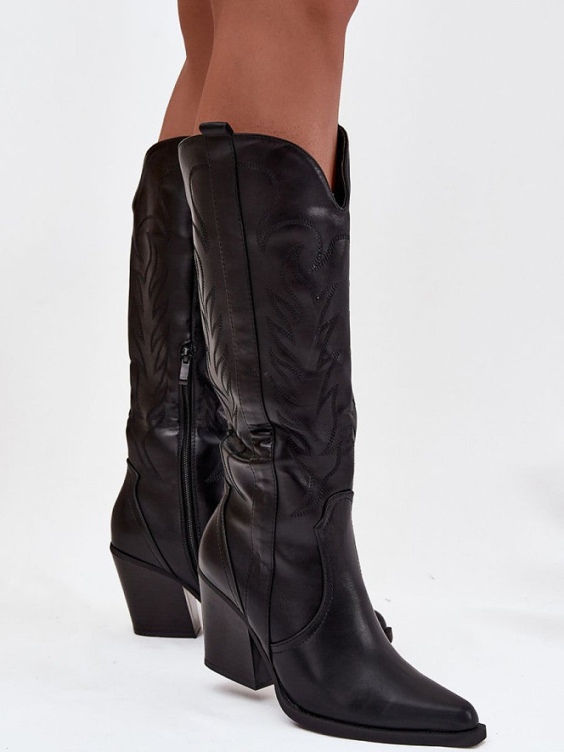 Cizme de damă în stil cowboy, confecționate din piele ecologică, reprezintă o propunere elegantă pentru femeile care apreciază caracterul modern și western. Modelul este plasat pe un toc stabil, în formă de coloană, care accentuează designul lor original și oferă confort în timpul mersului. Cusăturile caracteristice de pe tija adaugă întregii perechi un stil special, iar vârfurile ascuțite subțiază optic picioarele. Cizmele sunt de tip slip-on, cu o fermoar suplimentar pentru a ușura încălțarea. Interiorul căptușit cu spumă acoperită cu material textil garantează confortul și căldura în zilele mai reci. Este alegerea ideală pentru femeile care își doresc să îmbine confortul cu un accent modern, ușor rock, perfecte pentru blugi, rochii sau fuste în stil boho.