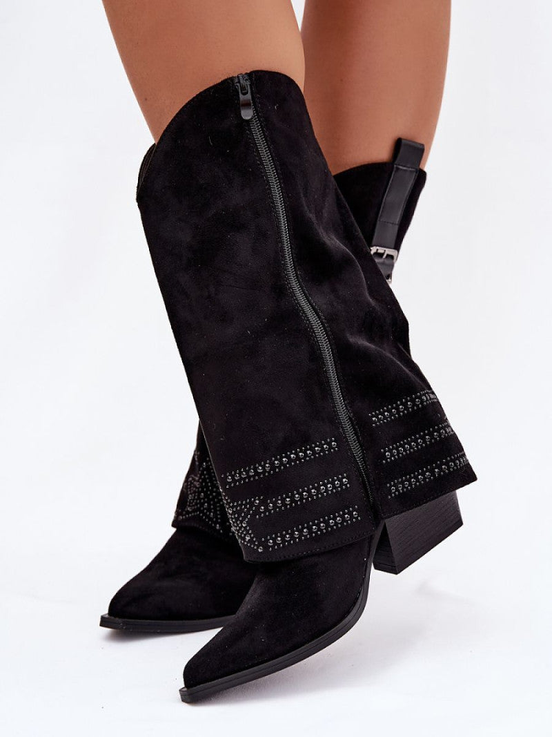 Cizme cowboy pentru femei din eko catifea sunt un model elegant pentru iubitoarele stilului western. Plasate pe un toc scund de tip stâlp conferă siluetei ușurință, iar vârfurile ascuțite subliniază stilul lor caracteristic, feminin. Tija este decorată cu o curea decorativă cu cataramă care rulează de-a lungul lateralelor, conferindu-le un aspect original și la modă. Este o croială ideală pentru stilizările de toamnă-iarnă.