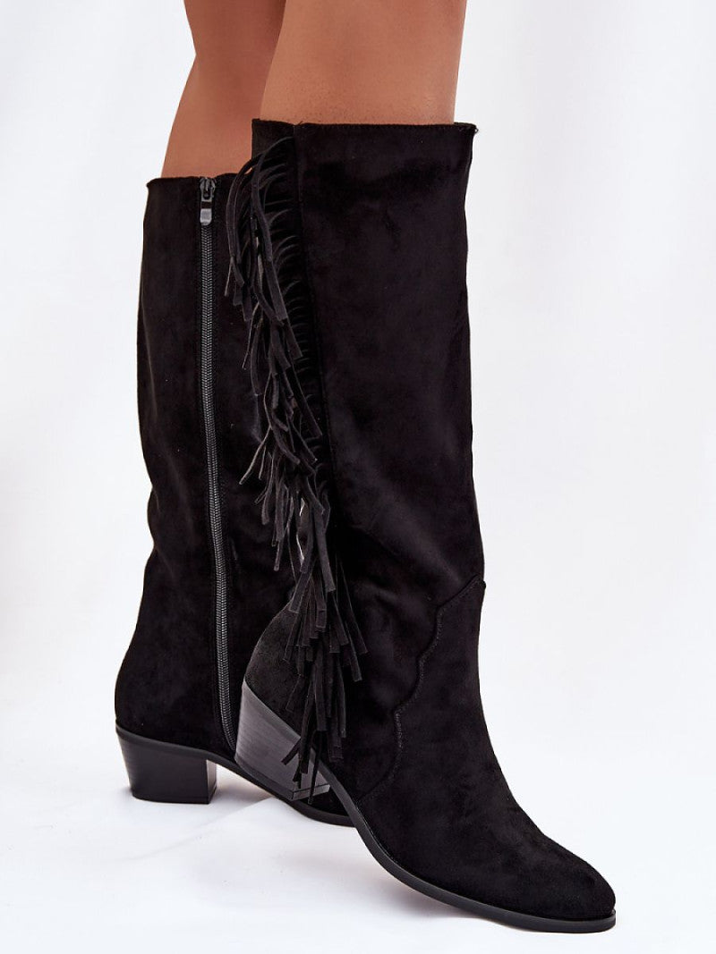Cizmele pentru femei din piele ecologică sunt o propunere elegantă pentru zilele mai reci. Modelul așezat pe un toc mic și tăiat asigură confort și stabilitate, iar vârfurile în formă de migdale adaugă eleganță. Interiorul căptușit cu blană de încălțăminte garantează căldură și confort în timpul purtării. Căptușeala este decorată cu franjuri moderne, care conferă întregului un accent caracteristic feminin. Perfecte pentru stilizările de toamnă-iarnă.