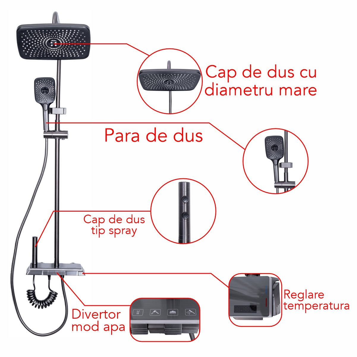 Sistemul include un cap de dus fix, ideal pentru o experienta relaxanta si uniforma, alaturi de un cap de dus mobil,