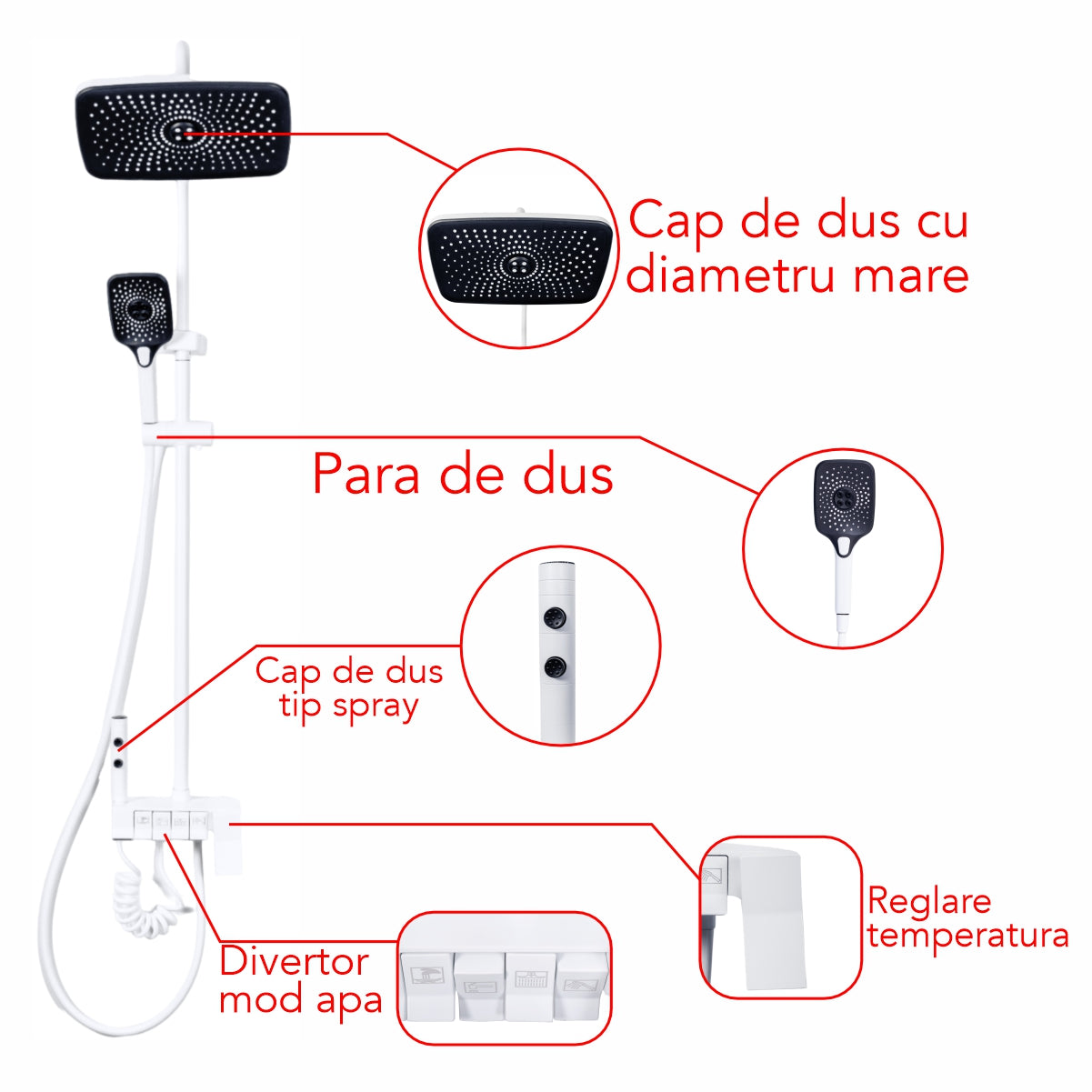 Sistemul include un cap de dus fix, ideal pentru o experienta relaxanta si uniforma, alaturi de un cap de dus mobil,