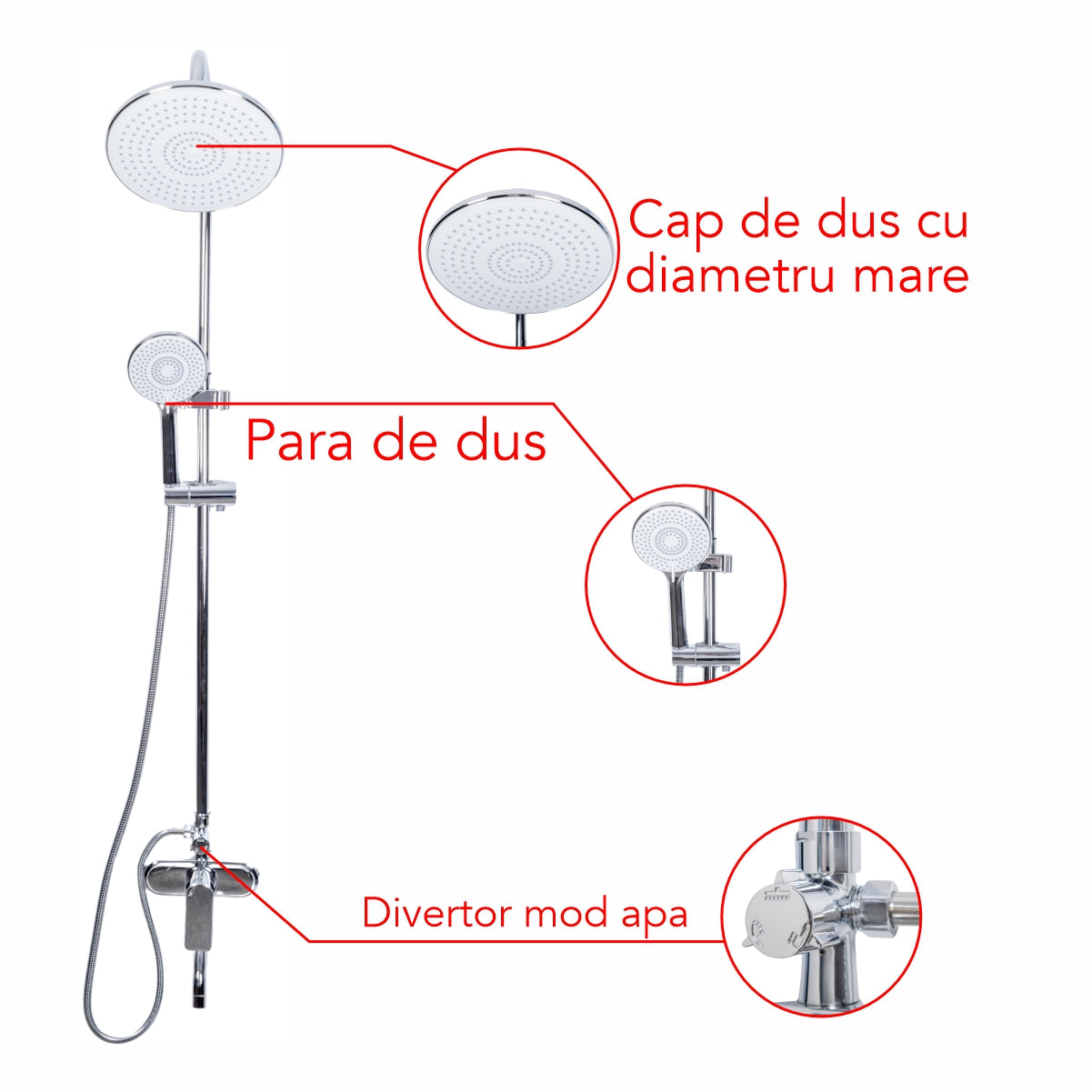 Sistemul include un cap de dus fix, ideal pentru o experienta relaxanta si uniforma, alaturi de un cap de dus mobil,