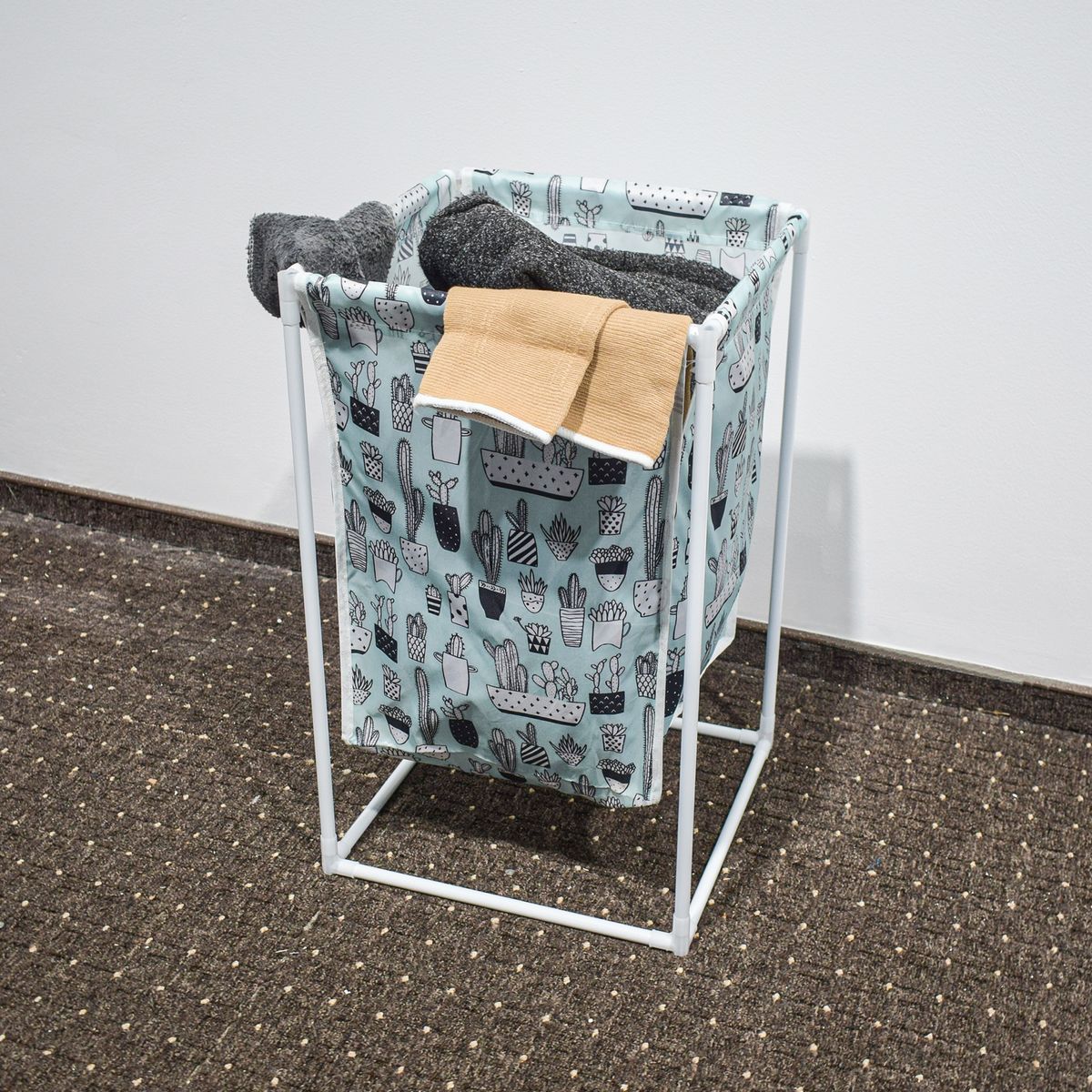 Imprimeul de pe cosul de rufe transforma acest obiect de uz casnic intr-un element de design in propria casa.