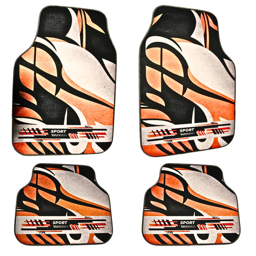 Adaugă dinamism și stil interiorului mașinii tale cu covorașele auto universale DECOMAT, în varianta „Urban Velocity”! Acest design grafic inspirat de linii fluide și contraste puternice de portocaliu, negru și alb conferă un aspect modern și sportiv oricărui autoturism.