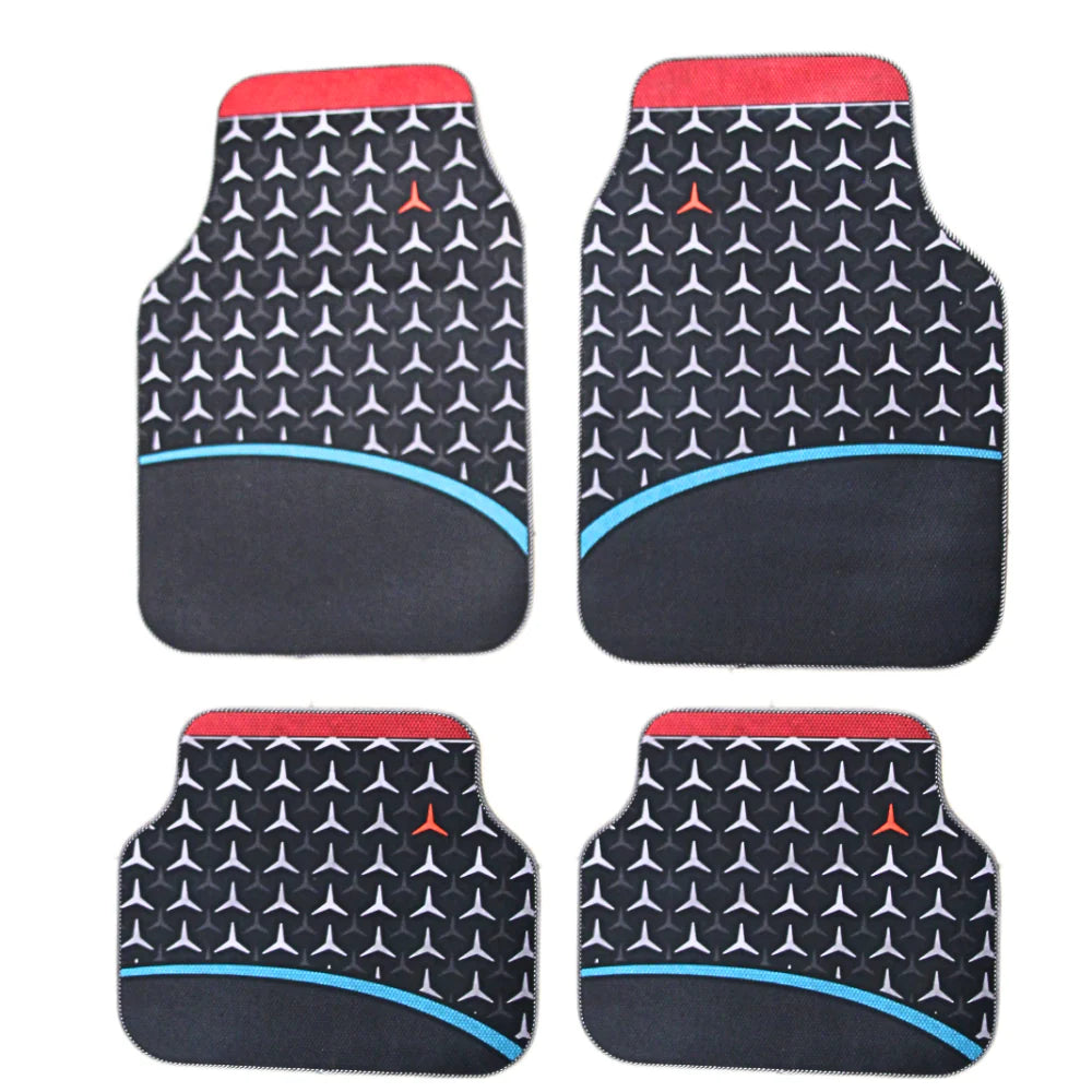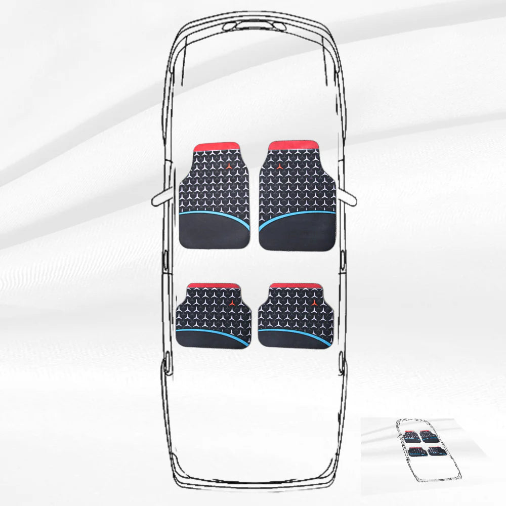 Adaugă un plus de stil interiorului mașinii tale Mercedes cu acest set de covorașe auto universale cu imprimeu abstract inspirat de emblema clasică Mercedes-Benz. Modelul în culori negru, roșu și albastru deschis oferă un aspect modern și sofisticat, fiind compatibil vizual cu toate modelele Mercedes-Benz, indiferent de generație.