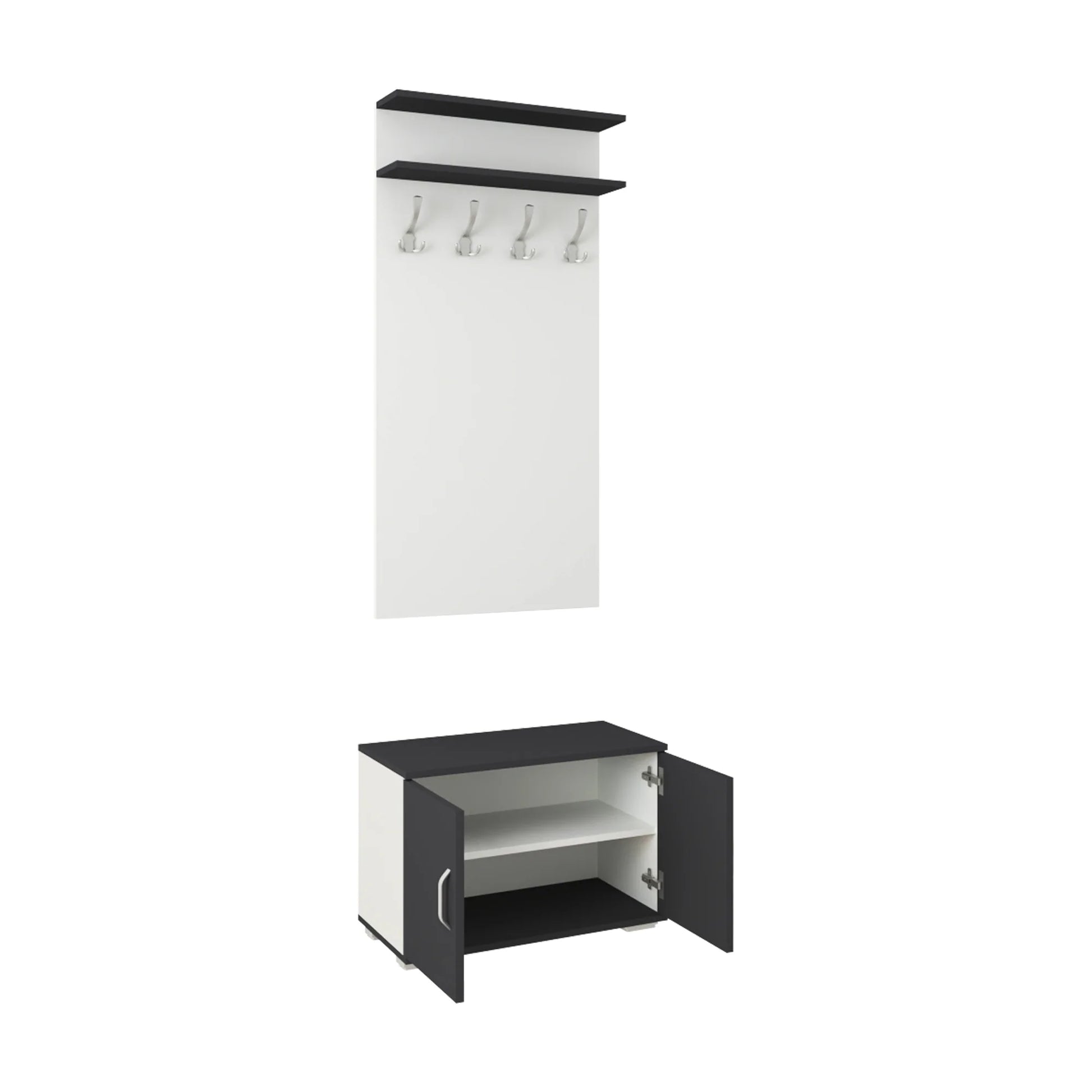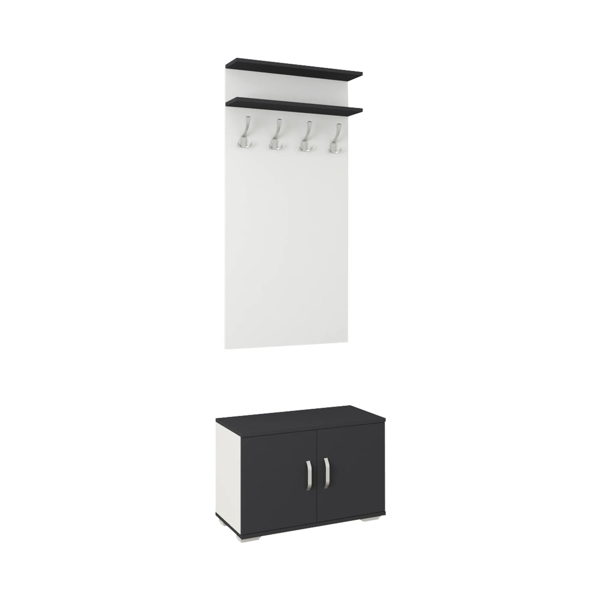 Produsul este realizat din PAL melaminat de 16 mm si se bucura de un design contrastant din punct de vedere cromatic datorita celor doua culori: antracit si alb. Astfel, il poti potrivi cu mare usurinta in stilul tau de amenajare al spatiului. Cuierul Como are in componenta sa un pantofar cu polita, un cuier cu suporti si doua polite pentru depozitare. Structura sa a fost gandita astfel incat sa iti ofere cat mai multe spatii de stocare a hainelor si incaltamintei, fara a ocupa prea mult spatiu. Achizitioneaza un Cuier Como ca parte a setului pentru hol Como si relaxeaza-te in confortul propriei tale locuinte.