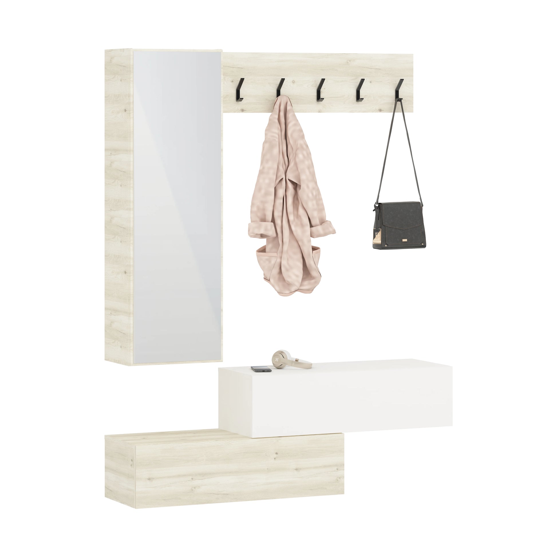 Dotat cu 5 agățători metalice, un dulap cu oglindă și un compartiment de depozitare suspendat, acest cuier este ideal pentru păstrarea hainelor și accesoriilor la îndemână. Elementele sale se fixează pe perete, oferind un aspect aerisit și bine organizat.