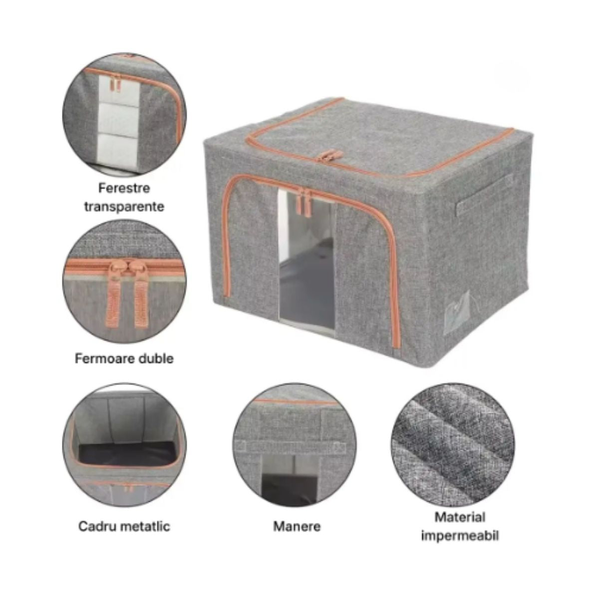 Cutie Depozitare Multifunctionala, cu Cadru Metalic, Fermoar Dublu și Ferestre Transparente, Naimeed D7653, dimensiuni 50x40x33cm, Gri inchis
