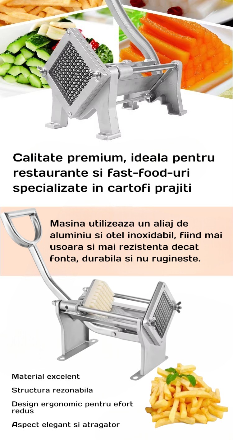 Aceasta masina de taiat legume este un dispozitiv profesional, ideal pentru restaurante, fast-food-uri sau uz casnic.