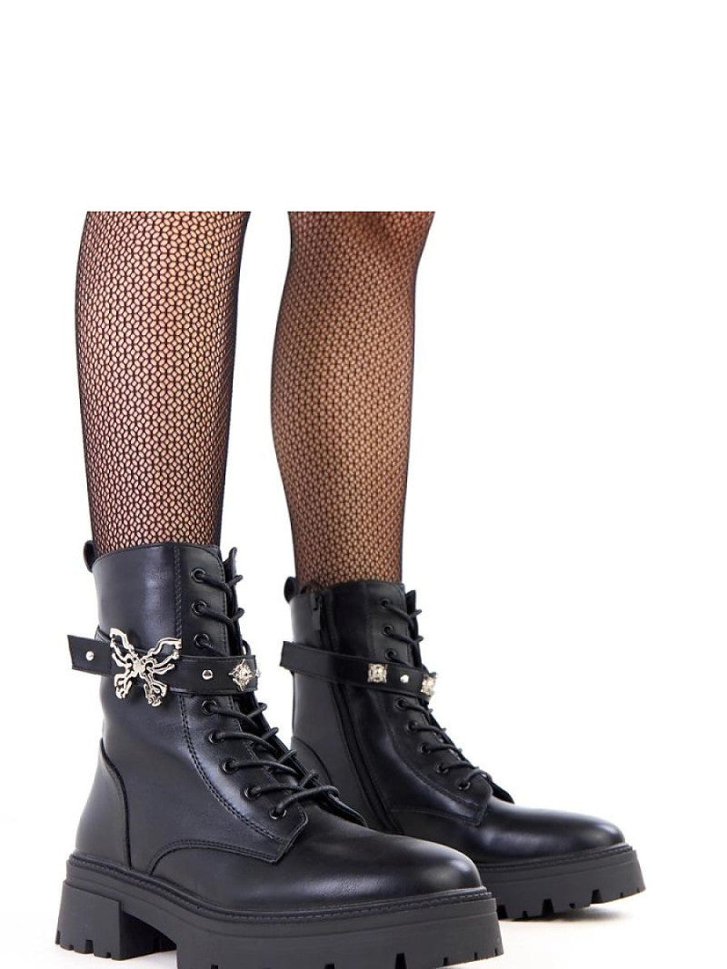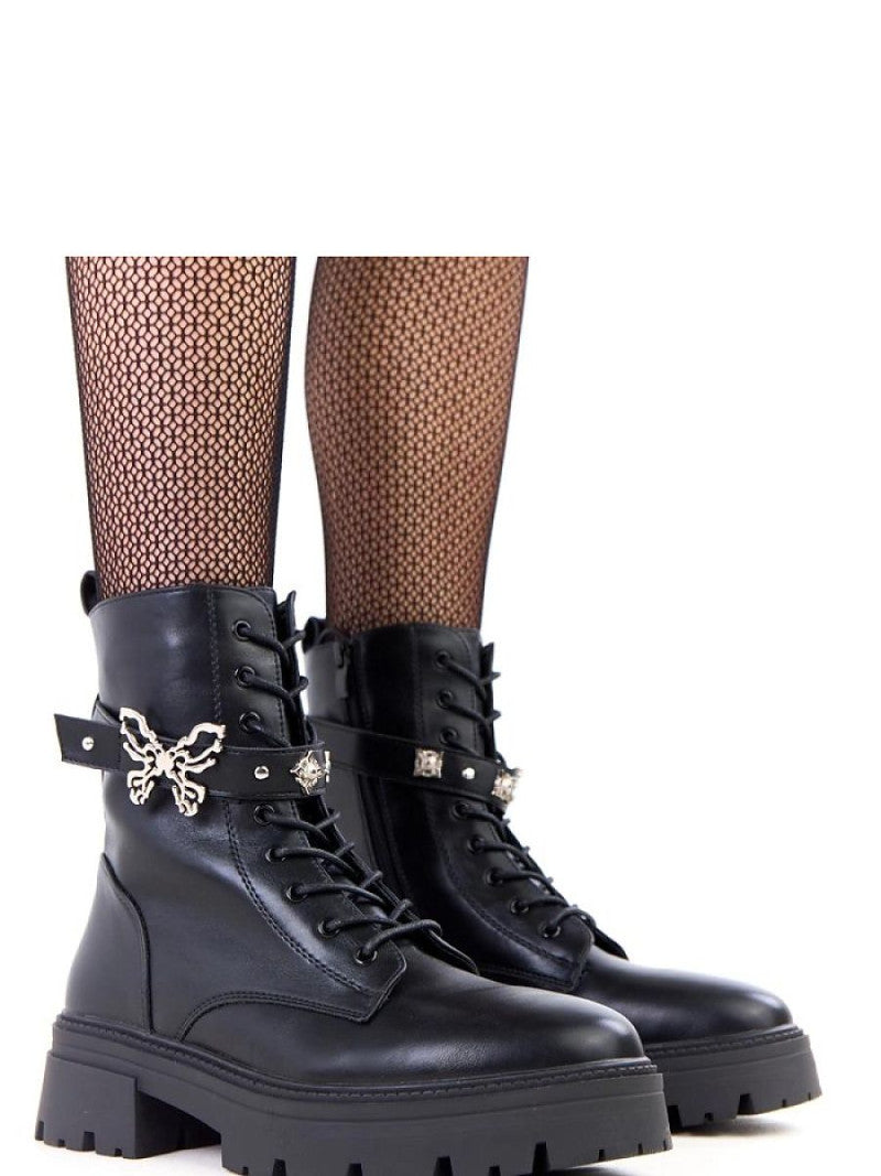 Botinele elegante și practice pentru femei, fabricate din piele ecologică de înaltă calitate, sunt o alegere excelentă pentru zilele mai reci. Modelul îmbină croiala clasică cu detalii moderne, făcându-l potrivit atât pentru ținutele de zi cu zi, cât și pentru cele mai casual. Pantofii au închidere cu fermoar pentru a-i îmbrăca rapid, precum și șireturi suplimentare, care permit ajustarea perfectă a încălțămintei pe picior. Un farmec special este adăugat de curea decorativă cu fluture metalic, un accent subtil care subliniază caracterul feminin al botinelor. Datorită căptușelii interioare și a tălpilor moi de material textil, pantofii asigură confortul și căldura în timpul purtării. Tocul stabil de 5 centimetri și tija înaltă care ajunge peste gleznă garantează confortul și siguranța în mers.