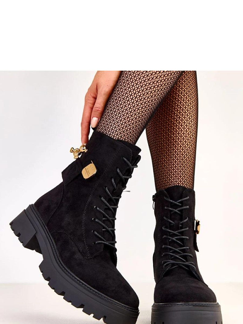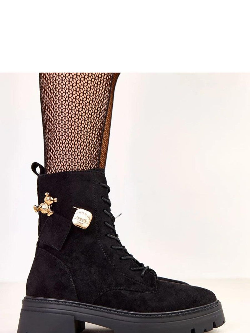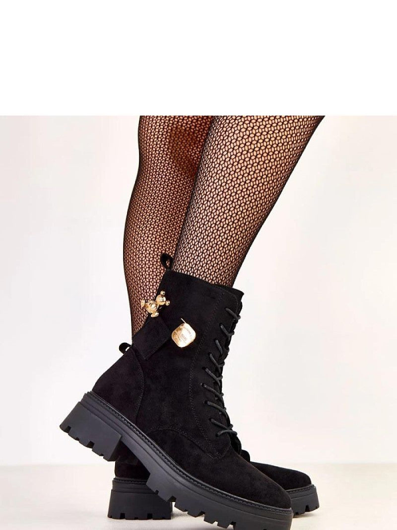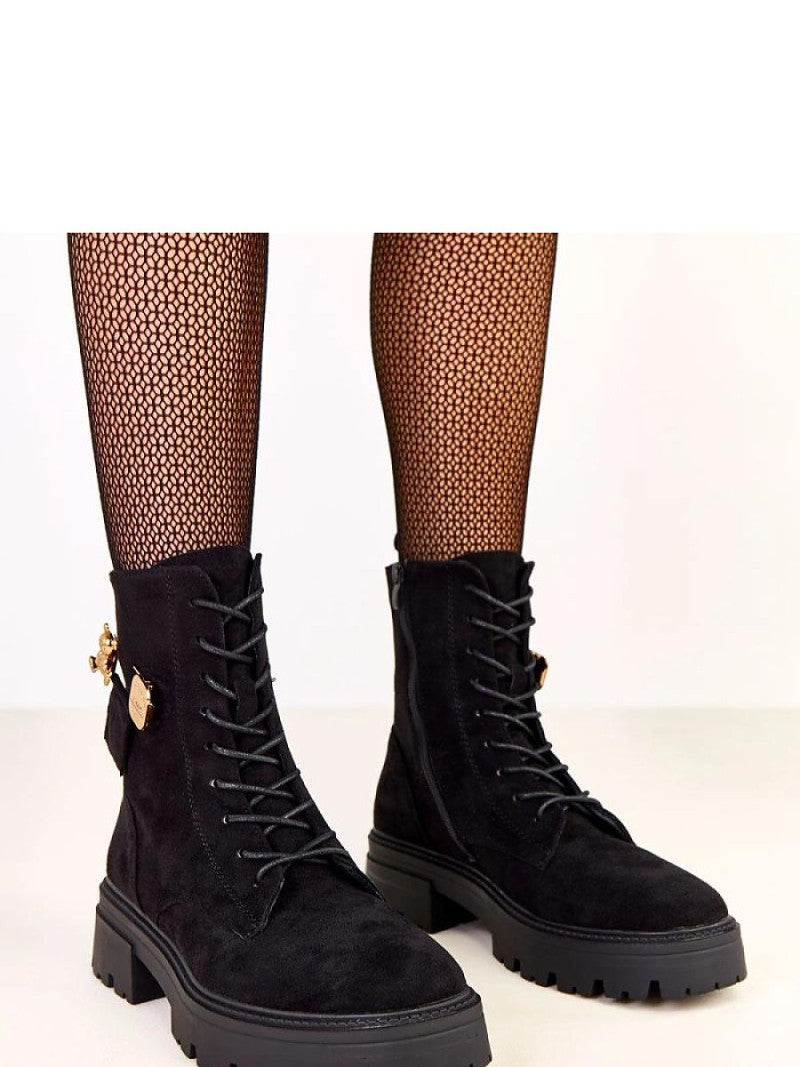 Modele de damă elegante și confortabile, care îmbină perfect stilul modern cu confortul utilizării. Fabricate din piele ecologică de înaltă calitate, cu aspect de catifea, arată elegant și sunt ușor de întreținut. Modelul are vârf rotund, izolație pentru a menține căldura în zilele mai reci și o tălpile înalte de 16,5 cm care se potrivește perfect piciorului. Tocul de 5,5 cm oferă un ușor înălțime, păstrând în același timp stabilitatea și confortul. Pantofii sunt prevăzuți cu șireturi în față și un fermoar lateral pentru a facilita încălțarea. Un farmec special este dat de pandantivul decorativ de culoare aurie cu un motiv de ursuleț, aducând un accent modern și ușor bijuterie. Talpa din material sintetic garantează durabilitatea și confortul la purtare. Este alegerea ideală pentru femeile care apreciază stilul, confortul și detaliile originale care adaugă personalitate ținutelor de zi cu zi.