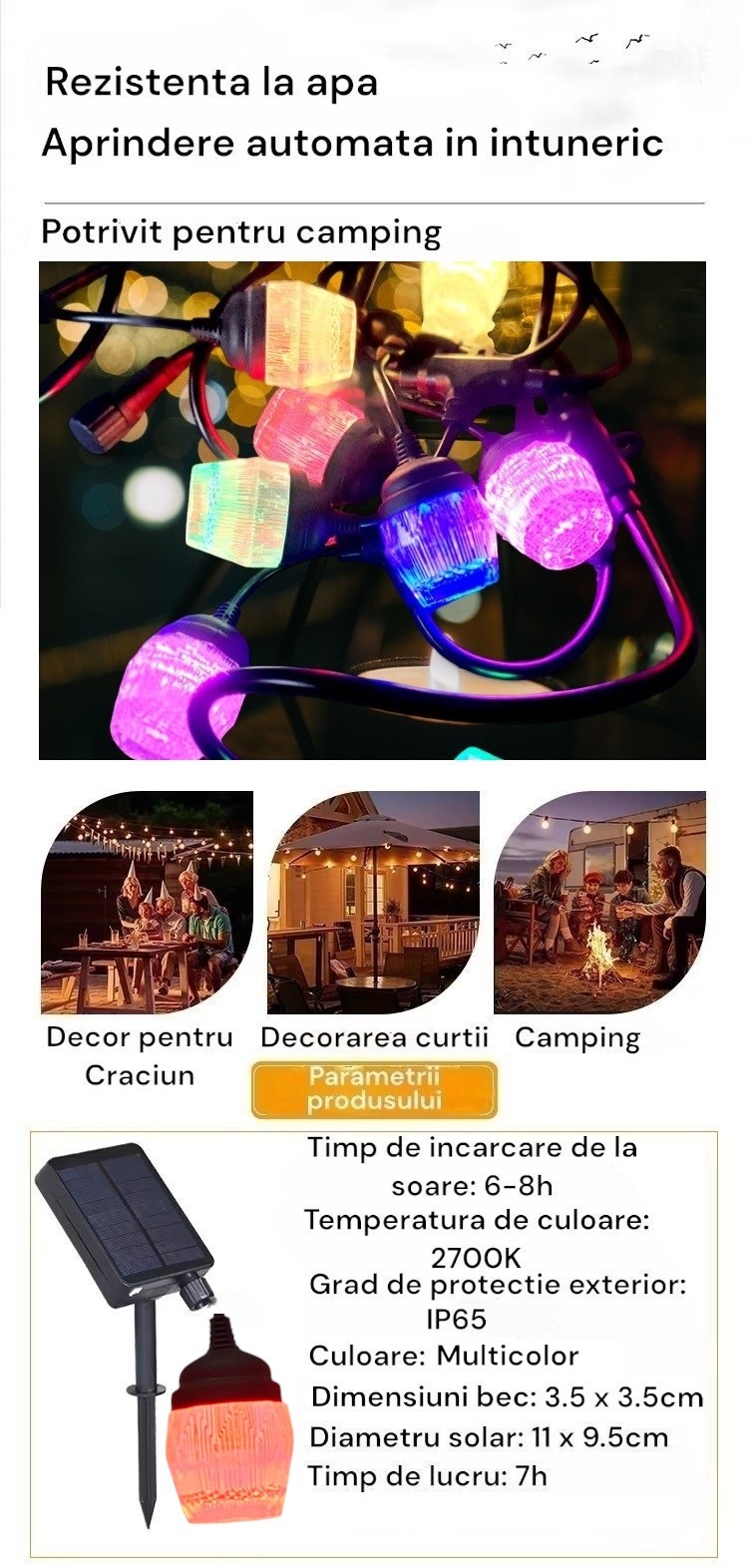 O ghirlanda solara de 5 metri, echipata cu cablu gros de 8 mm si 10 becuri liniare LED amplasate la o distanta de 50 cm intre ele,