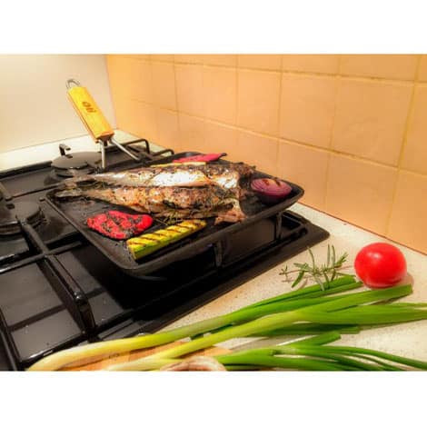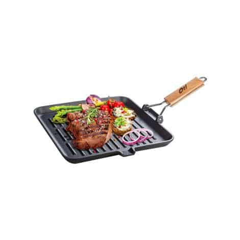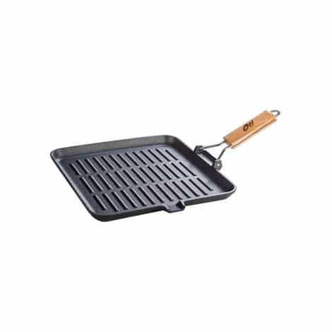 Cu un maner pliabil, gratarul din fonta pura de la Oti este usor de manevrat si depozitat, extrem de practic in orice bucatarie.