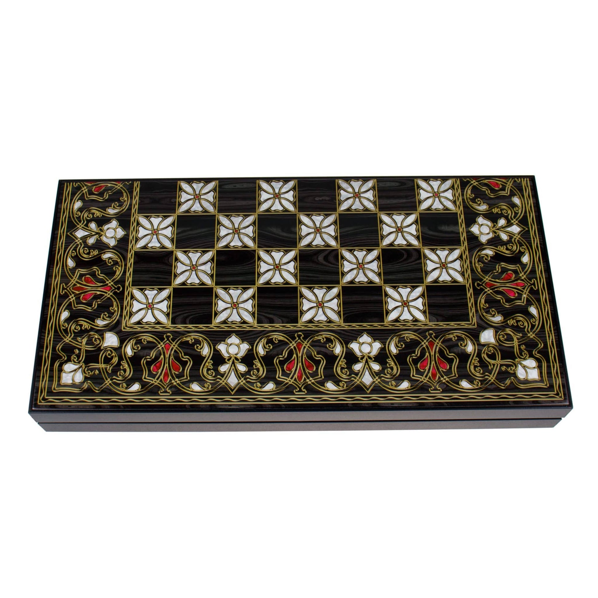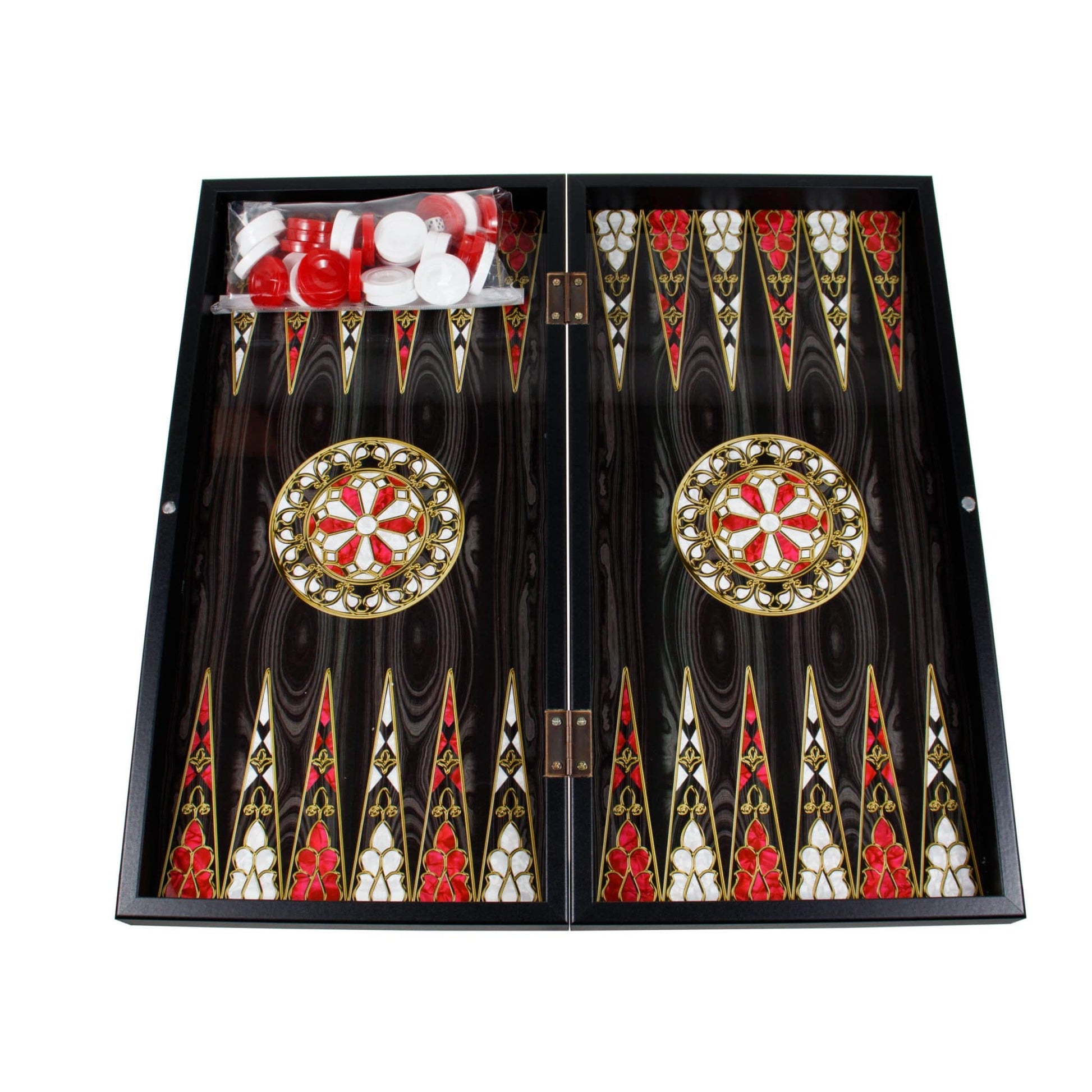 Jocul de table este de o calitate superioara datorita lacului de protectie ce ii confera o stralucire si o alunecare perfecta a pieselor pe tabla de joc.Jocul contine 2 zaruri si 30 piese.