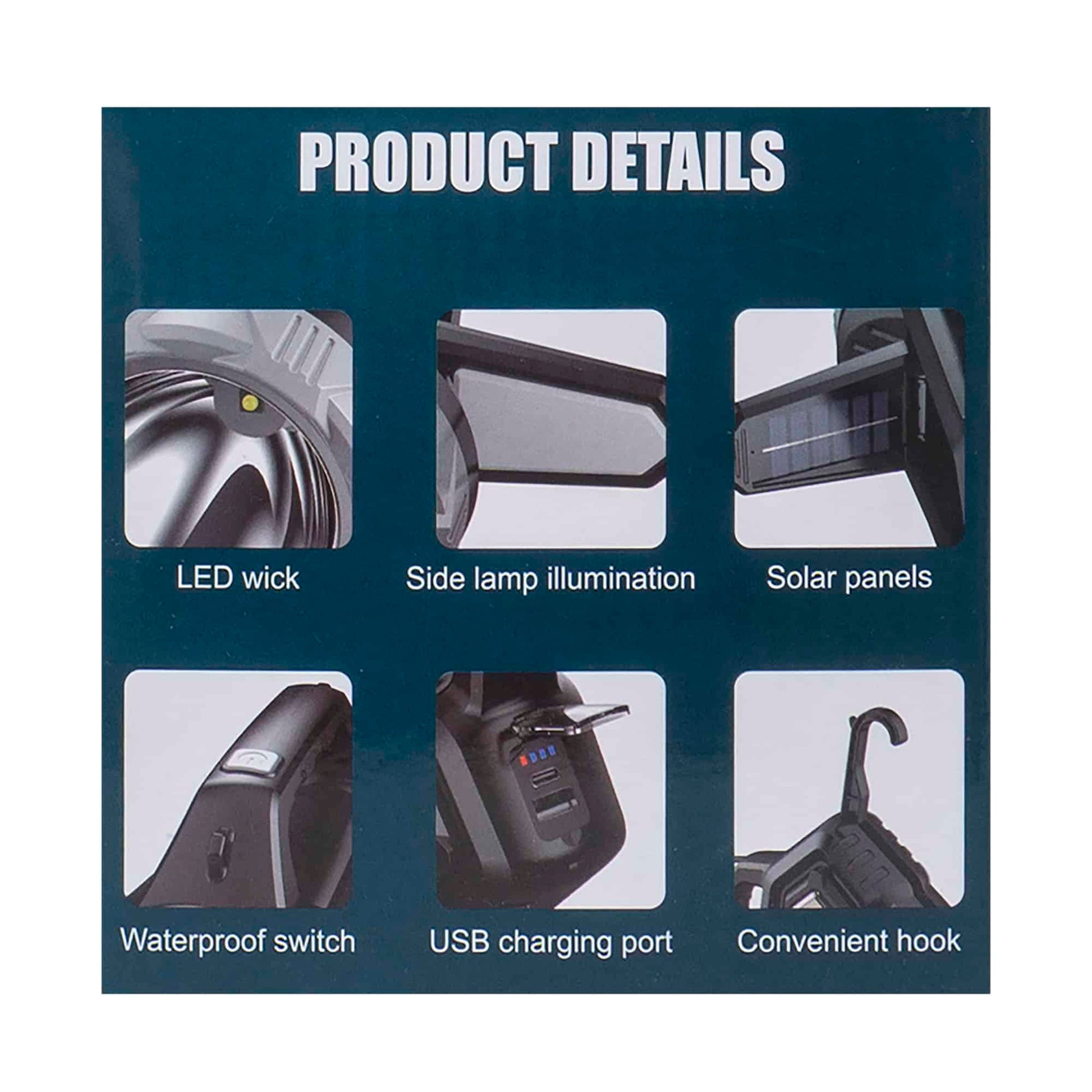 Lanterna led, portabila cu agatatoare, incarcare solara si USB, lungime 19cm.