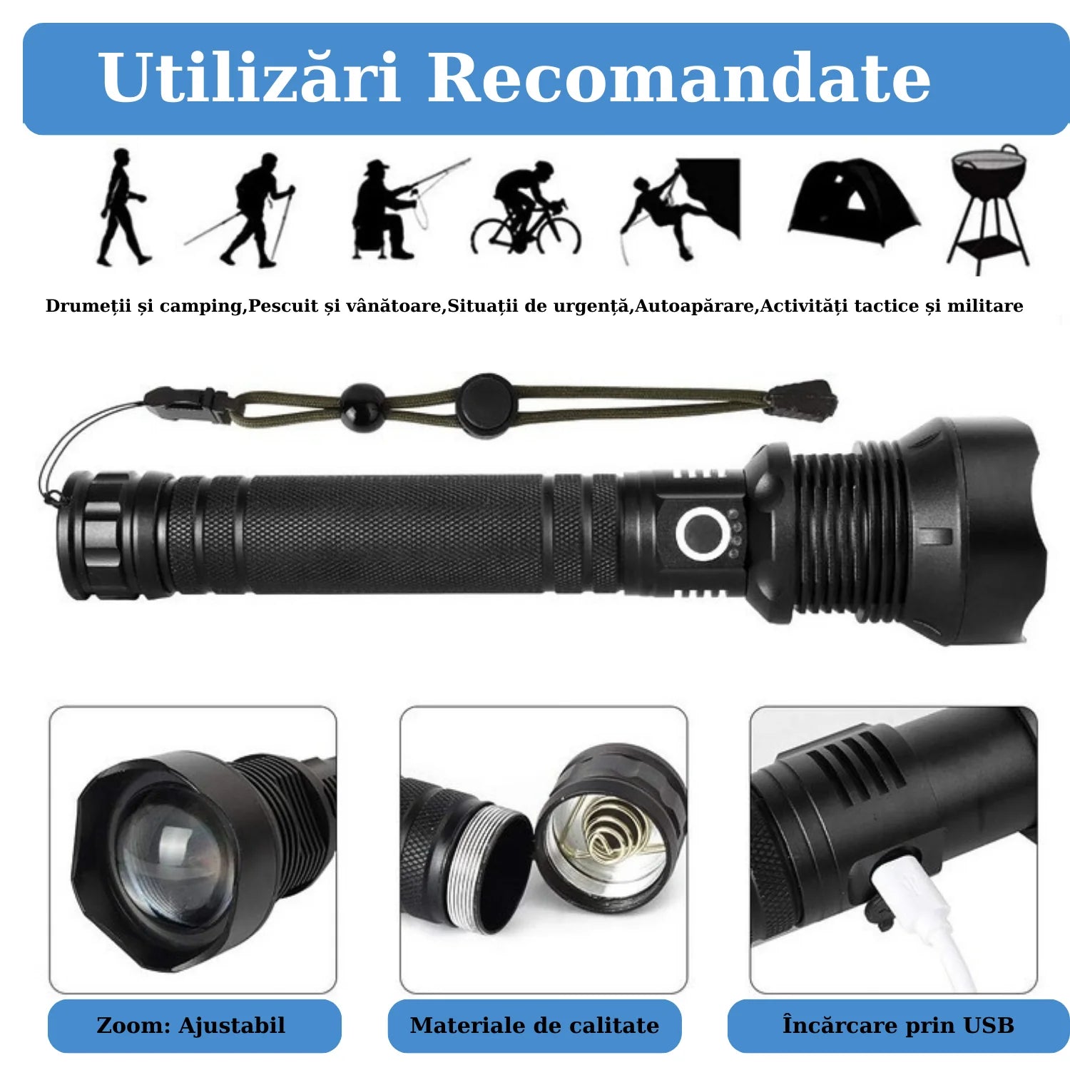 Lanternă Tactică LED XHP70 – 10.000 Lumeni, Zoom, 3 Moduri, USB Reîncărcabilă, Rezistență la Temperatură Scăzută, IPX5