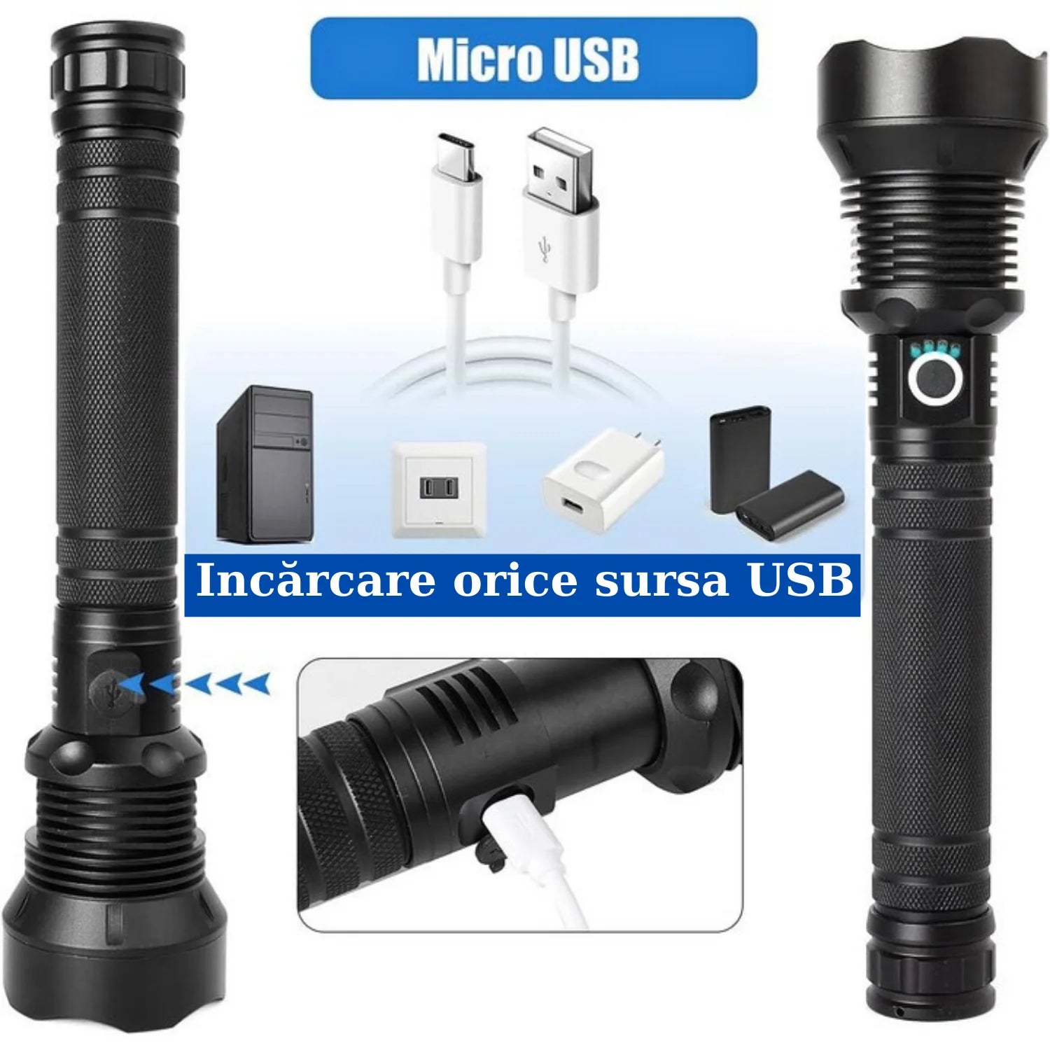 🔌 Încărcare prin USB – Poți folosi orice sursă de alimentare cu port USB: laptop, power bank, încărcător auto sau adapter de priză .