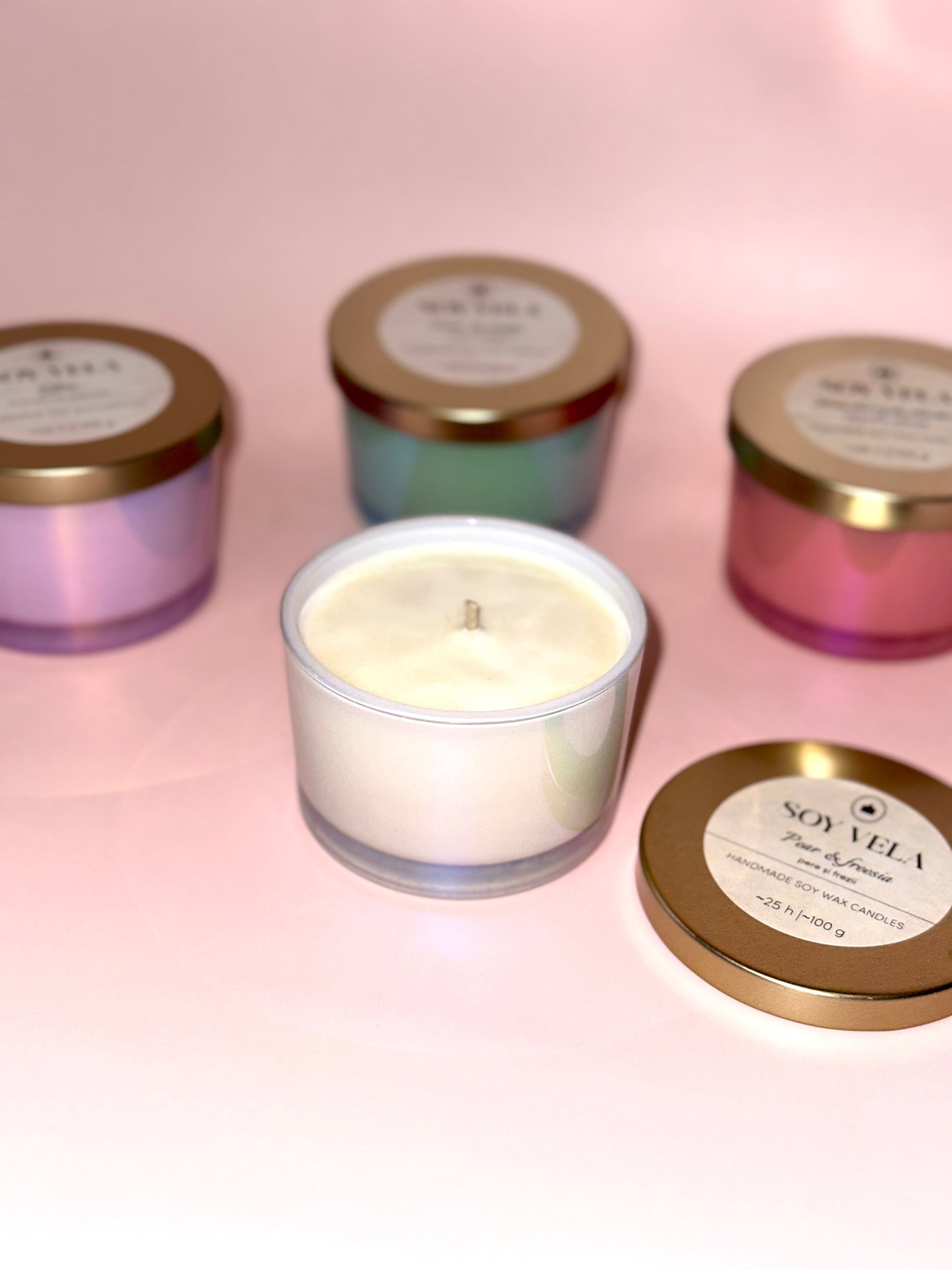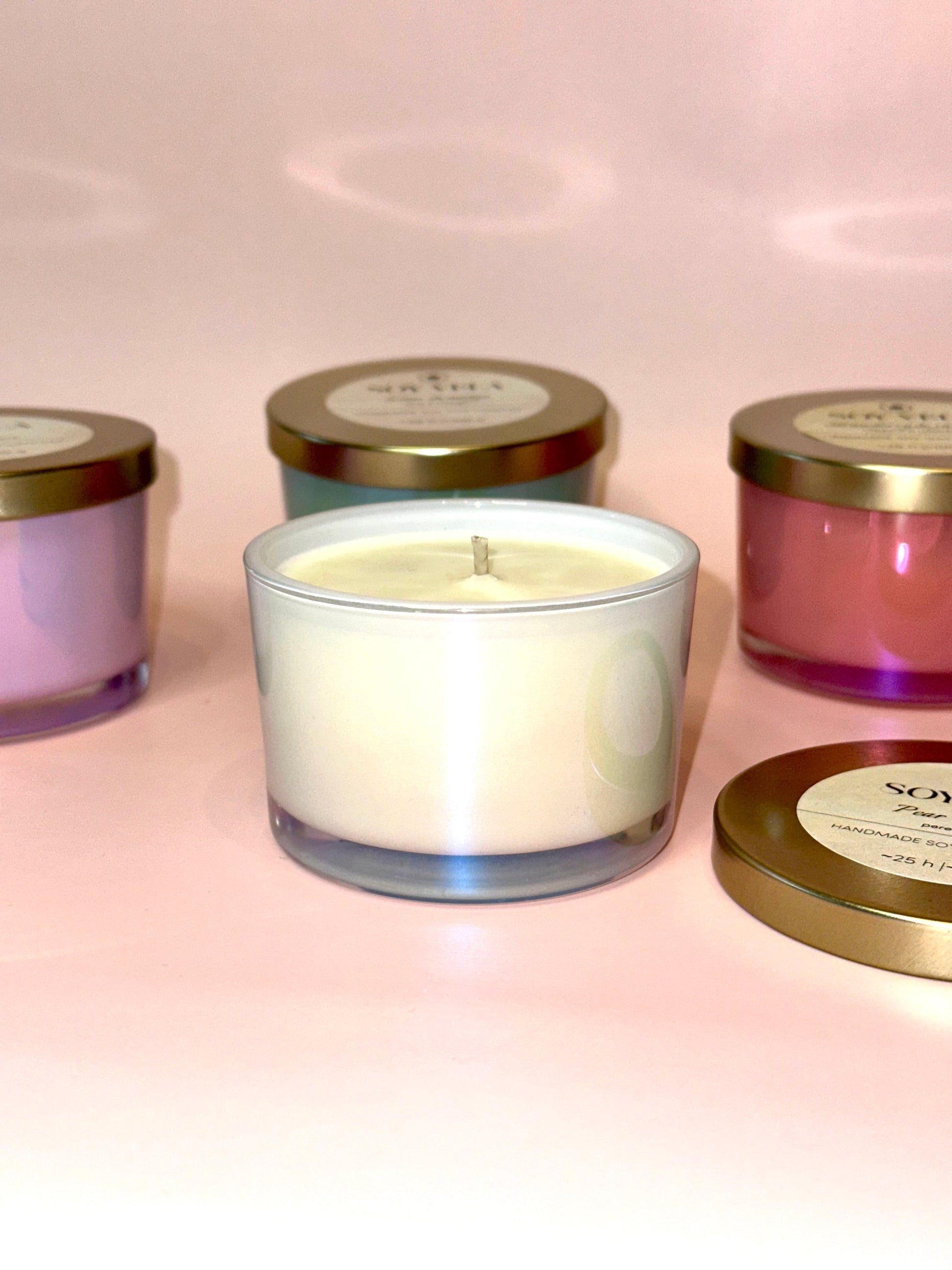 Recipietul are o culoare roz iridescent și este acompaniat de un capac auriu ce pastrează aroma lumânării pentru mai mult timp și oferă un aer de eleganță.