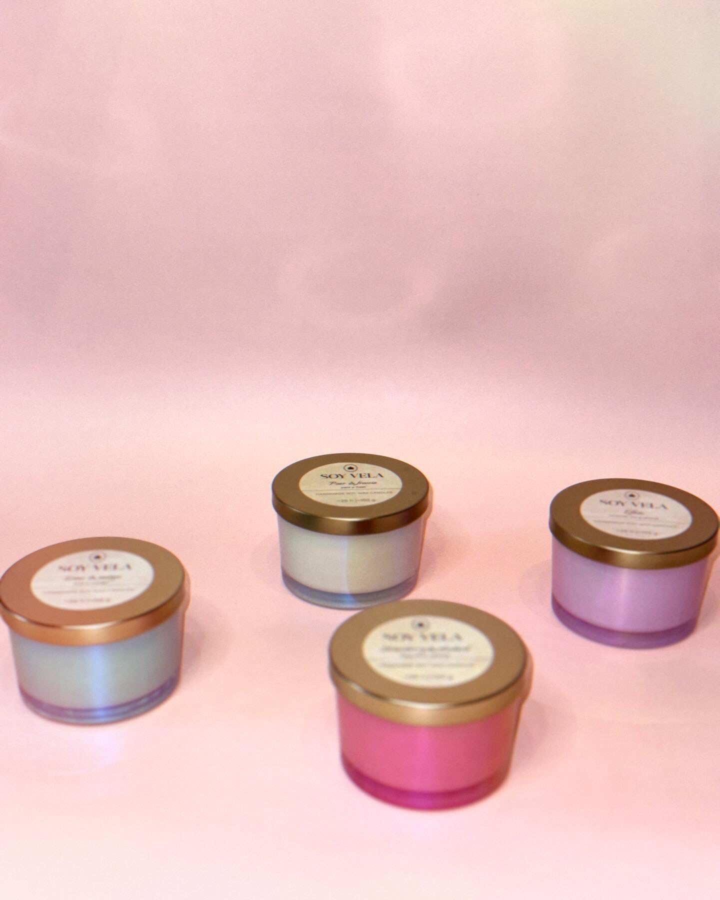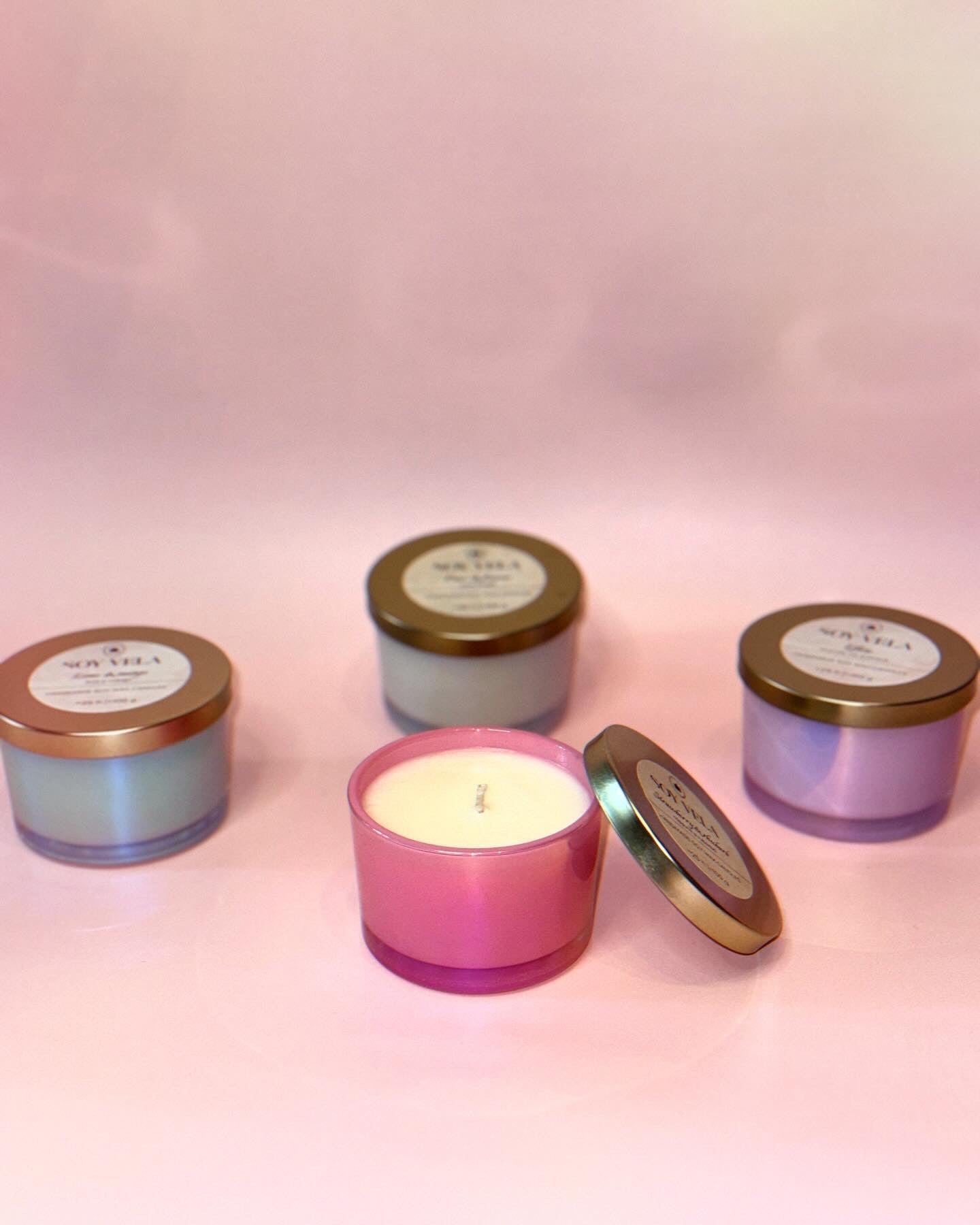 Recipietul are o culoare roz iridescent și este acompaniat de un capac auriu ce pastrează aroma lumânării pentru mai mult timp și oferă un aer de eleganță.