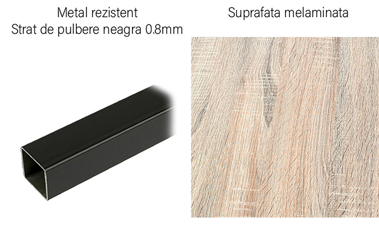 Blatul din MDF este acoperit cu un finisaj rezistent la zgarieturi si umezeala, asigurand o suprafata durabila si usor de curatat.