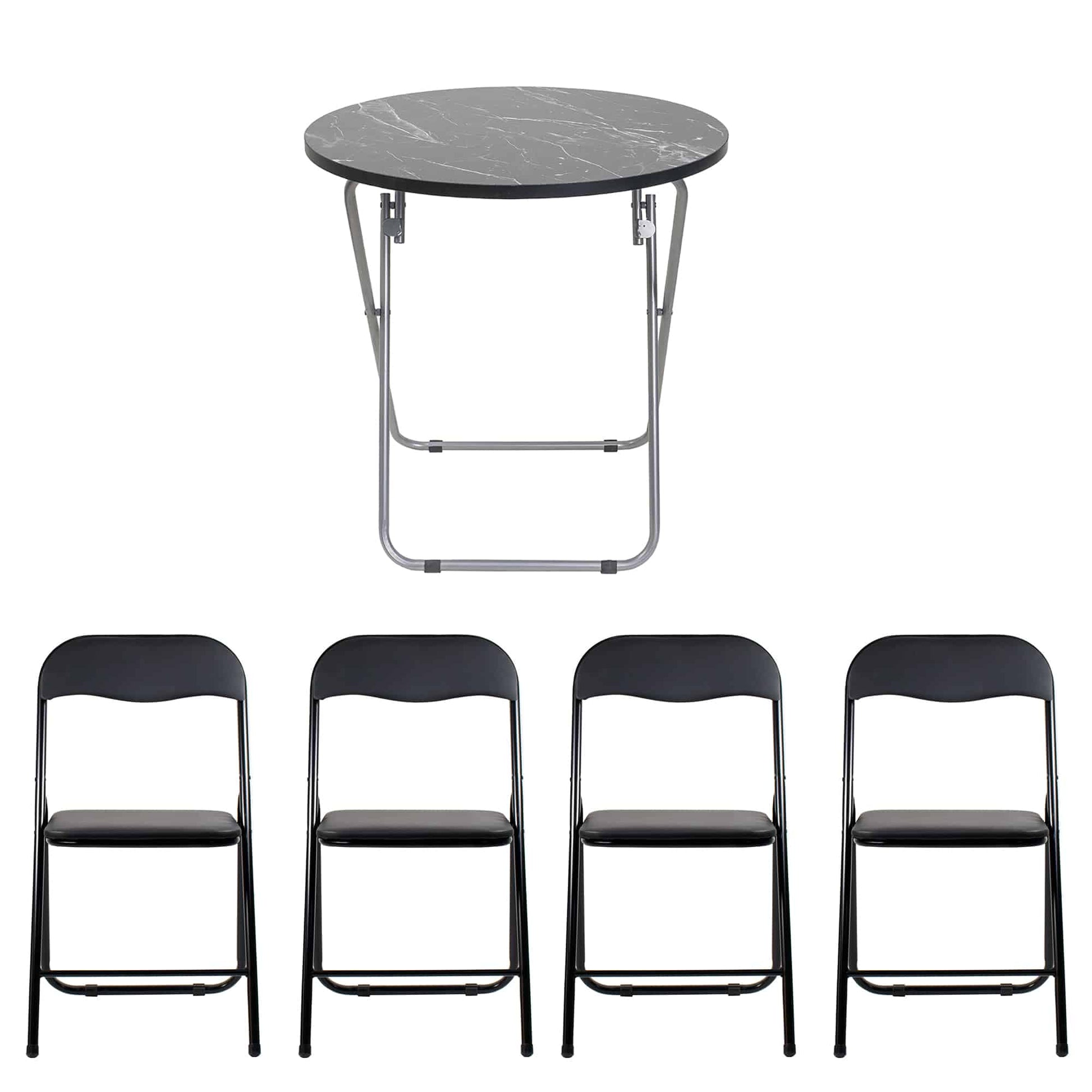 Masa plianta rotunda cu blat mdf, dimensiuni 60x65cm, negru (ZLN 6951) plus 4 x scaun bucatarie pliant (DSY 1115).