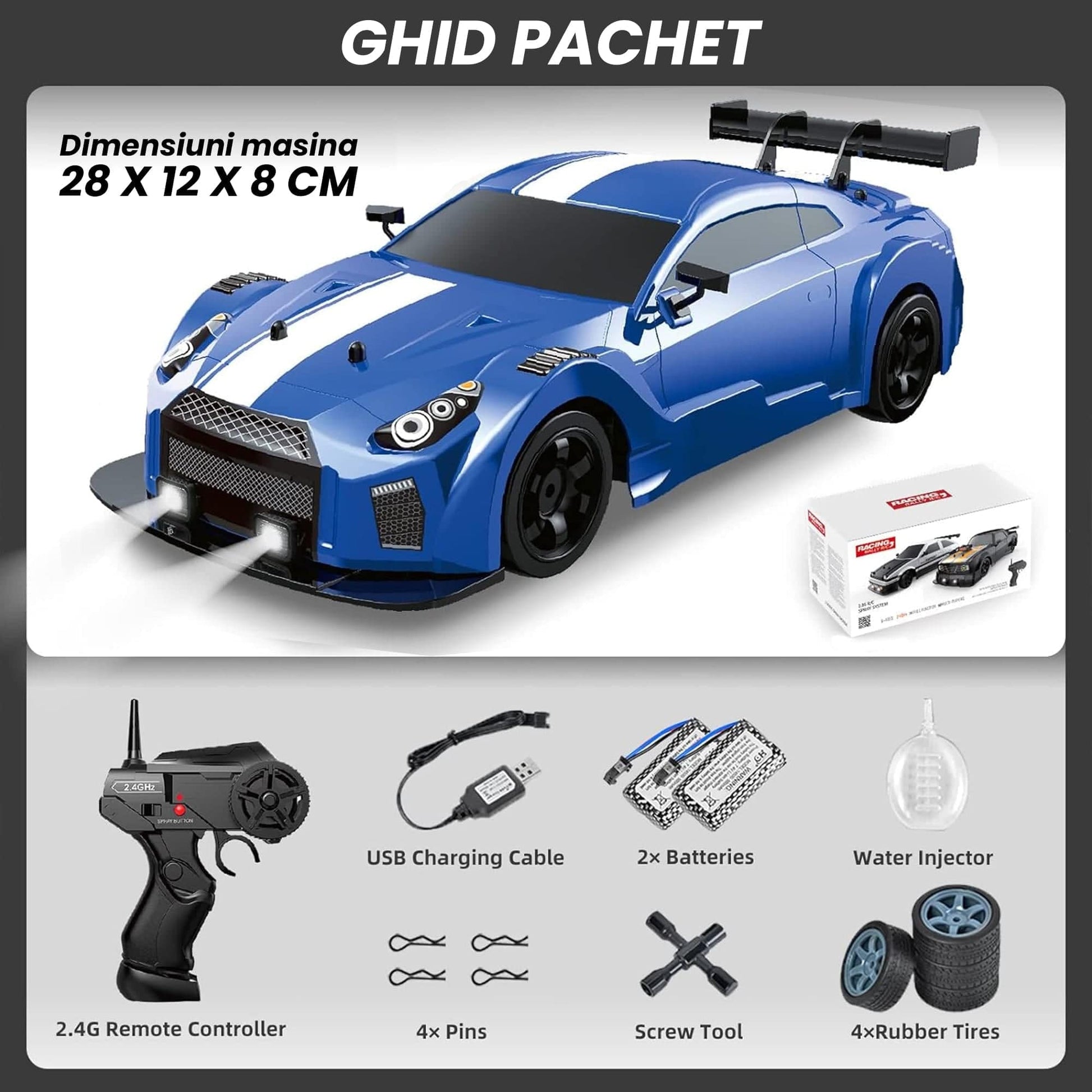 • 2 set-uri de roți: Vine cu două seturi de roți - drift și race - pentru a te bucura de performanță optimă pe orice suprafață.