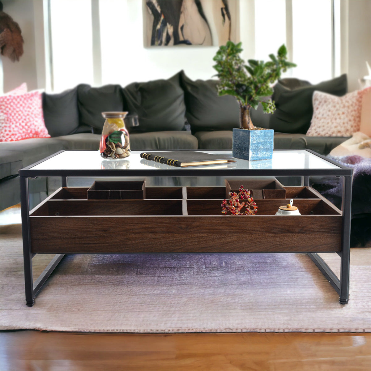 Masuta de cafea, blat din sticla, 4 compartimente, Naimeed N-175, Stejar Inchis, 100x55x42cm