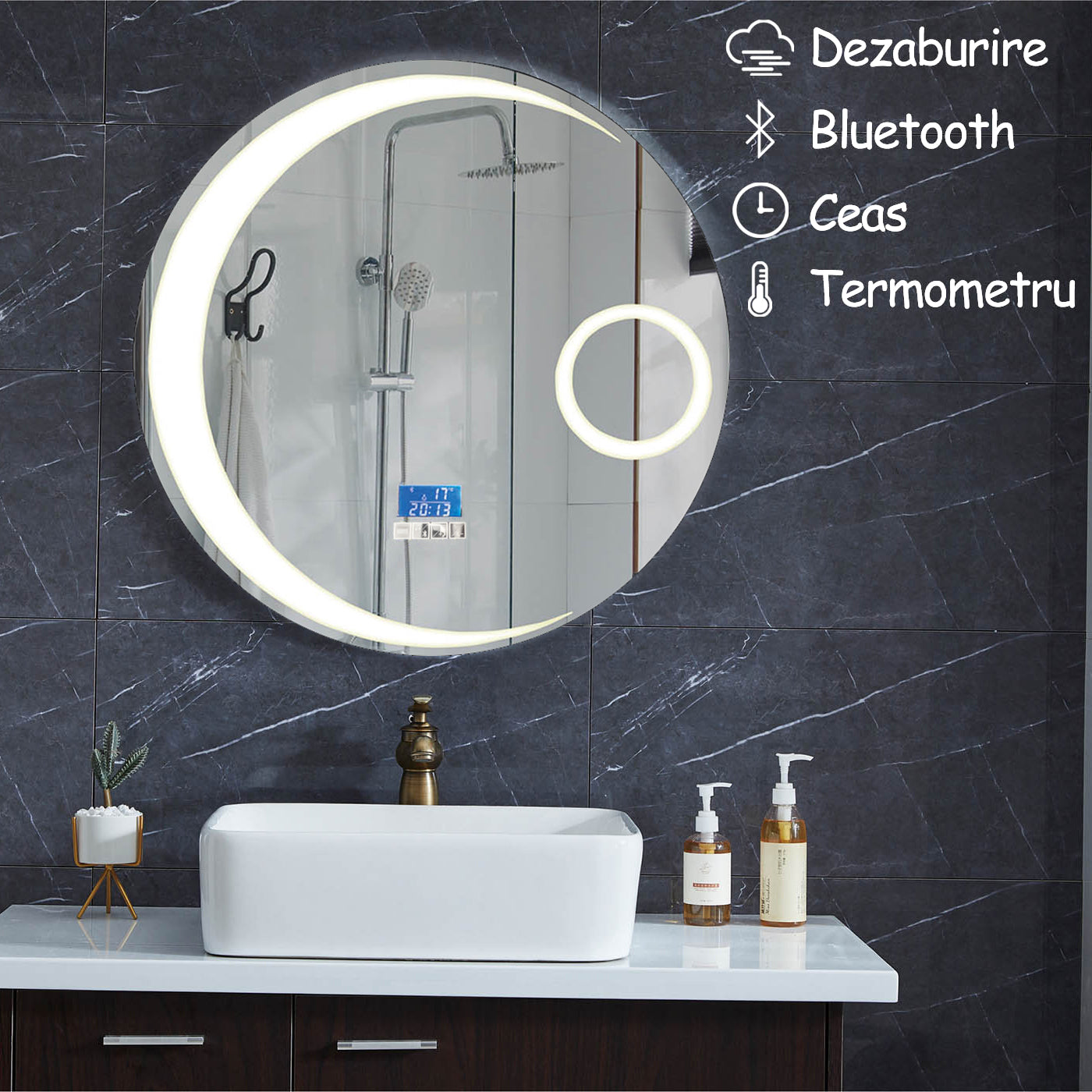 Oglinda de baie cu iluminare Led, Diametru 58.5cm, D3301/Functii dezaburire, Bluetooth, Ceas, Termometru