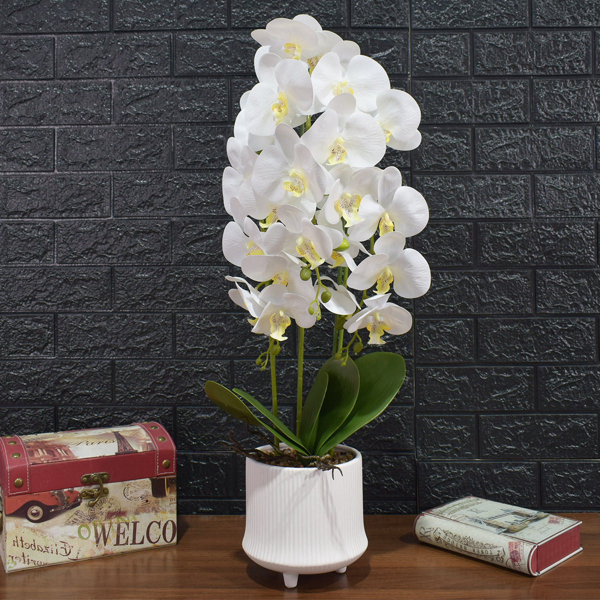Fie ca vorbim de living, dormitor sau chiar birou, aceasta orhidee artificiala in ghiveci ofera un accent cochet pentru un decor modern si elegant.