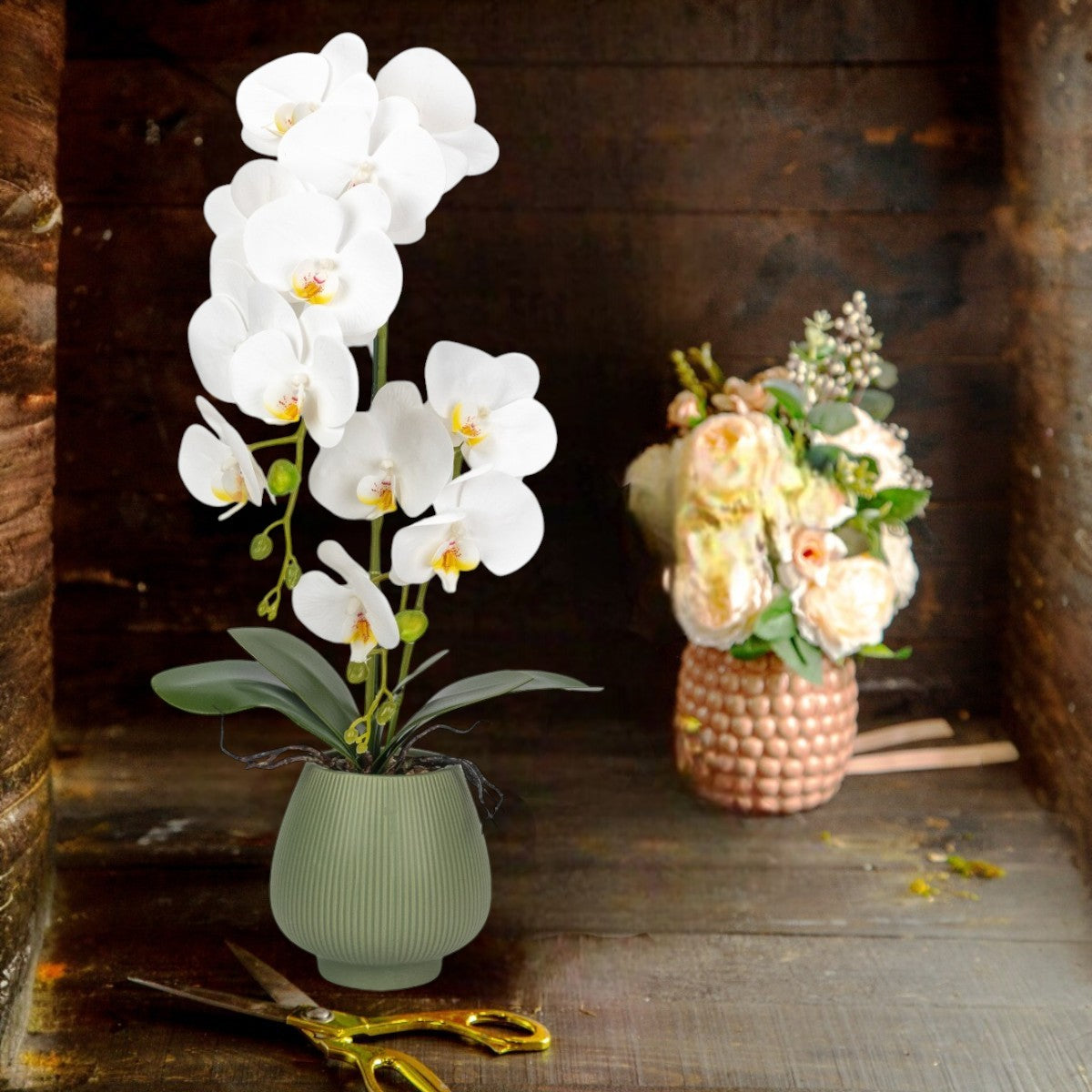 Fie ca vorbim de living, dormitor sau chiar birou, aceasta orhidee artificiala in ghiveci ofera un accent cochet pentru un decor modern si elegant.