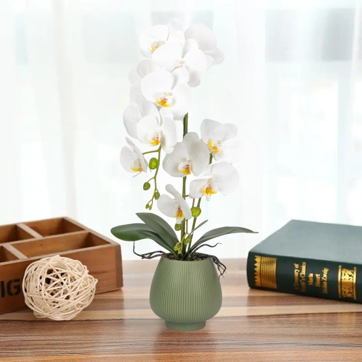 Orhidee cu aspect natural in ghiveci ceramic, 80 cm, Naimeed D6903, Alb/Verde