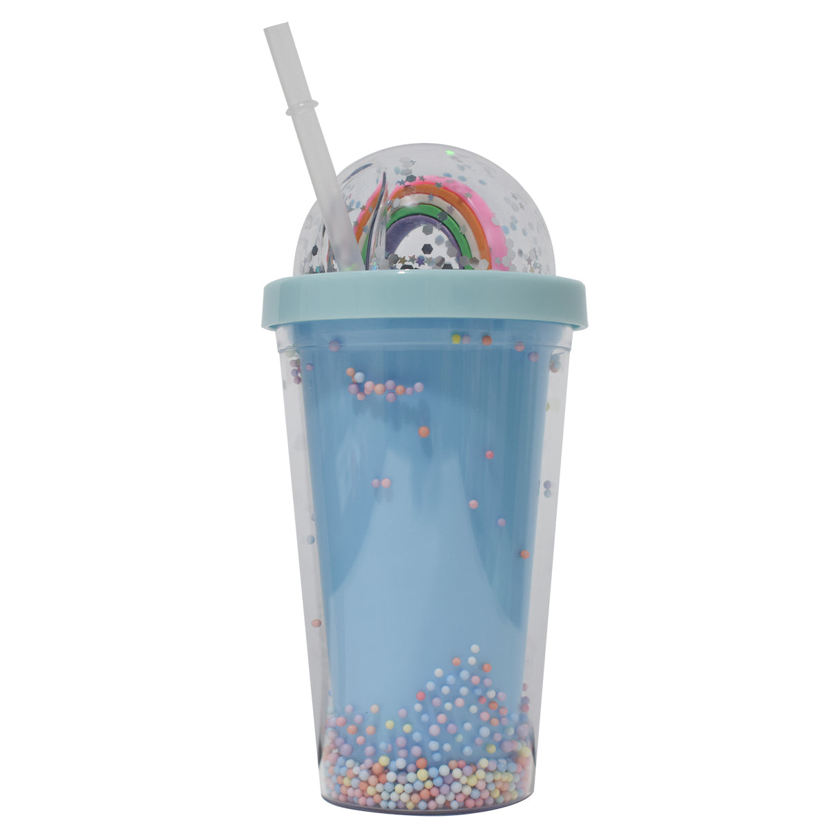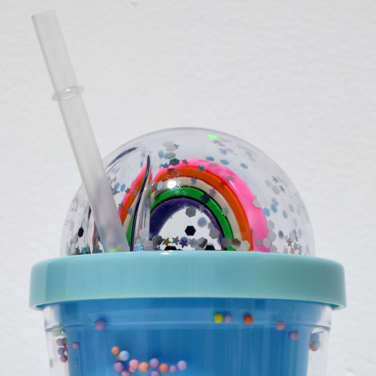 Cu un design captivant, paharul are un capac cu filet si o miniatură cu un curcubeu in interiorul acestuia, care va fascina copiii.